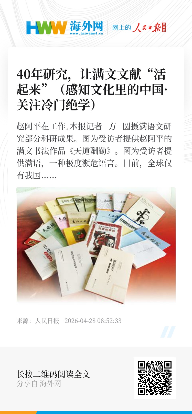 “满学不仅是解开历史密码的一把钥匙,更是铸牢中华民族共同体意识的重要实证依据。通过系统性抢救保护研究,让沉睡的满文文献‘活起来’,将濒危的满语传下去,方能守护中华文明多元一体的精神根脉。”赵阿平说。(本报记者 方 圆)