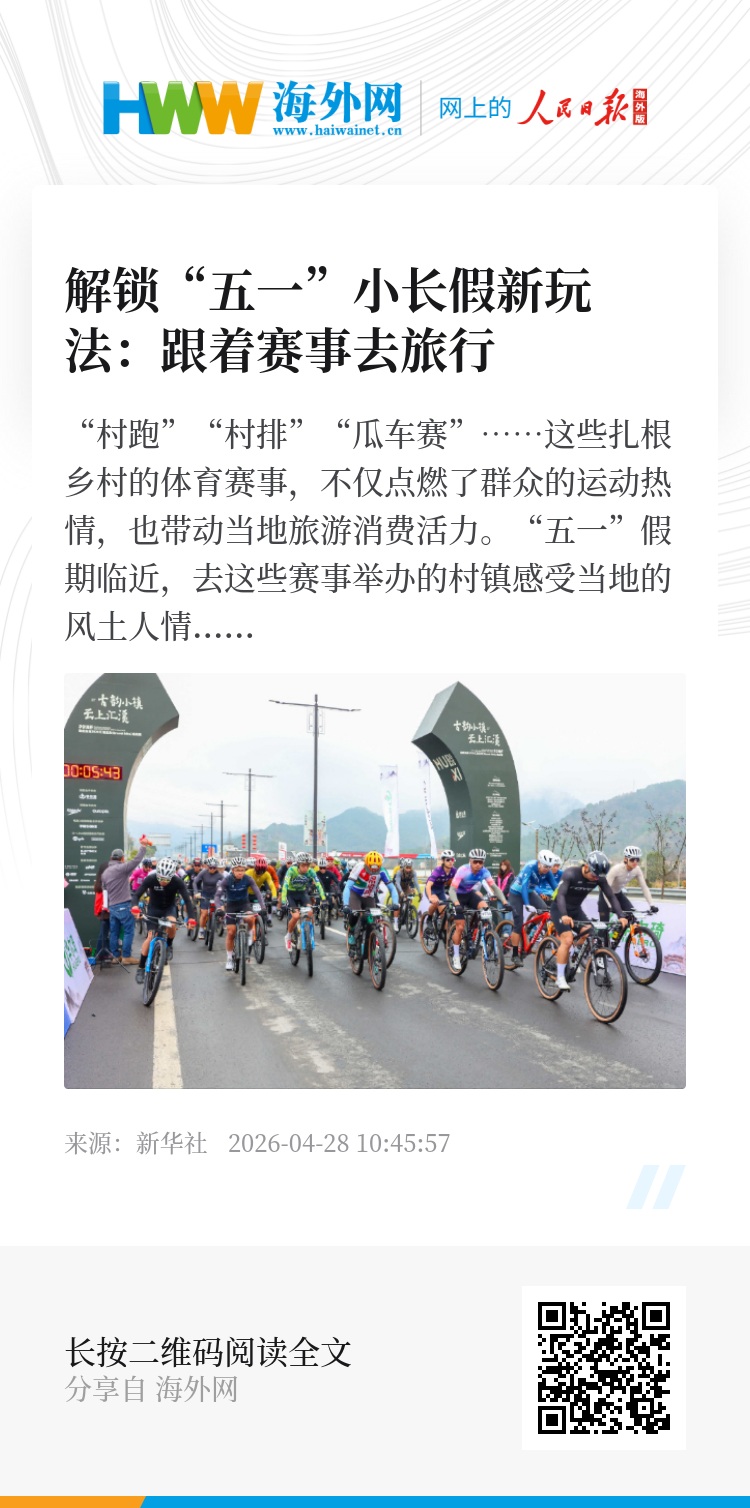 “村跑”“村排”“瓜车赛”……这些扎根乡村的体育赛事,不仅点燃了群众的运动热情,也带动当地旅游消费活力。“五一”假期临近,去这些赛事举办的村镇感受当地的风土人情,不失为出行的又一选择。