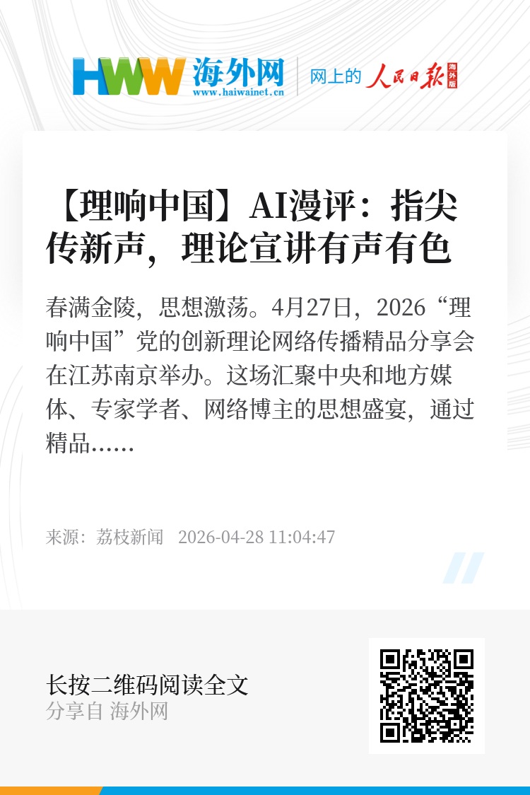 4月27日,2026“理响中国”党的创新理论网络传播精品分享会在江苏南京举办。这场汇聚中央和地方媒体、专家学者、网络博主的思想盛宴,通过精品案例分享、文艺节目展演等方式,推动党的创新理论“飞入寻常百姓家”。当理论宣讲遇上数字浪潮,当宏大叙事邂逅指尖传播,一场关于思想抵达方式的深刻变革正在发生。引导多元主体创作推出更多网民认可、社会认同、影响广泛的理论融媒体精品,更好发挥“指挥棒”“风向标”作用,让理论宣讲从“纸面”走到“指尖”、从“会场”走到“心间”。
