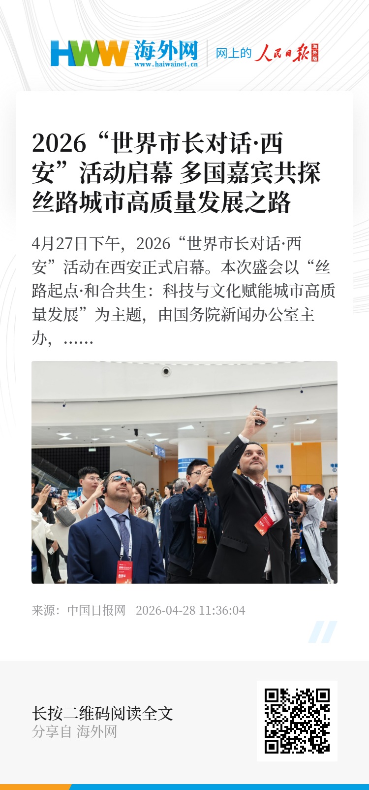 4月27日下午,2026“世界市长对话·西安”活动在西安正式启幕。本次盛会以“丝路起点·和合共生:科技与文化赋能城市高质量发展”为主题,由国务院新闻办公室主办,西安市人民政府、陕西省人民政府新闻办公室承办,汇聚7国7城市长及市长代表,共商城市发展大计、共话丝路文明交流、共绘国际合作蓝图。