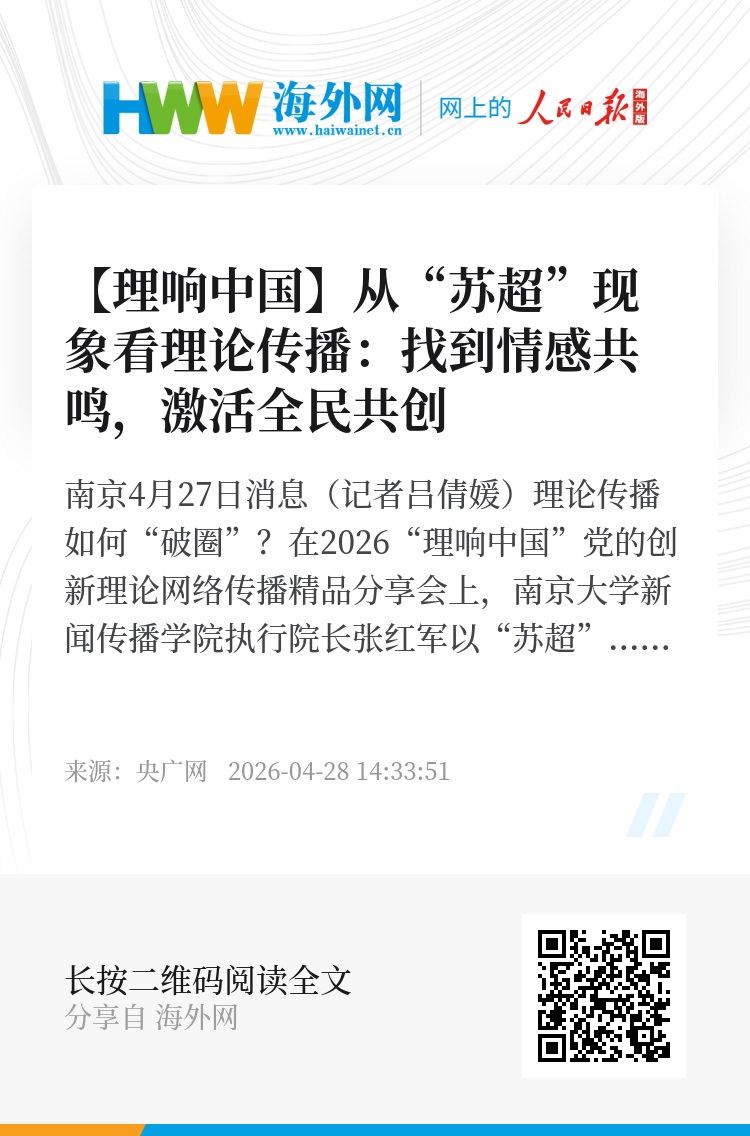 央广网南京4月27日消息(记者吕倩媛)理论传播如何“破圈”?在2026“理响中国”党的创新理论网络传播精品分享会上,南京大学新闻传播学院执行院长张红军以“苏超”现象为例,提供了一种值得借鉴的思路:找到情感“开关”,激活全民共创。