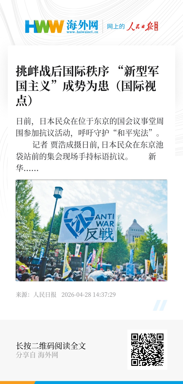历史上,日本军国主义通过制造“外部威胁”、煽动民族主义、绑架国家机器,对外发动侵略战争,犯下滔天罪行,给亚太地区人民带来浩劫。如今,日本右翼势力不但没有深刻反省侵略历史,反而不断推动安保政策朝着进攻性、扩张性方向转变,妄图通过重整军工复合体加速日本“再军事化”。多国学者和媒体指出,日方一系列举动破坏战后国际秩序,暴露高市早苗政府助推“新型军国主义”成势为患的危险动向。