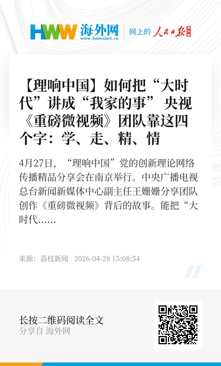 4月27日,“理响中国”党的创新理论网络传播精品分享会在南京举行。中央广播电视总台新闻新媒体中心副主任王姗姗分享团队创作《重磅微视频》背后的故事。能把“大时代”讲成“我家的事”,靠的是四个字:学、走、精、情,团队把学习作为每日必修课, 到总书记工作过的地方挖掘线索、收集素材,每个镜头切口精细、结构精准、表达精致,在剪辑时注意情感曲线,让真情自然流露,呈现出朴素真挚温暖的表达。