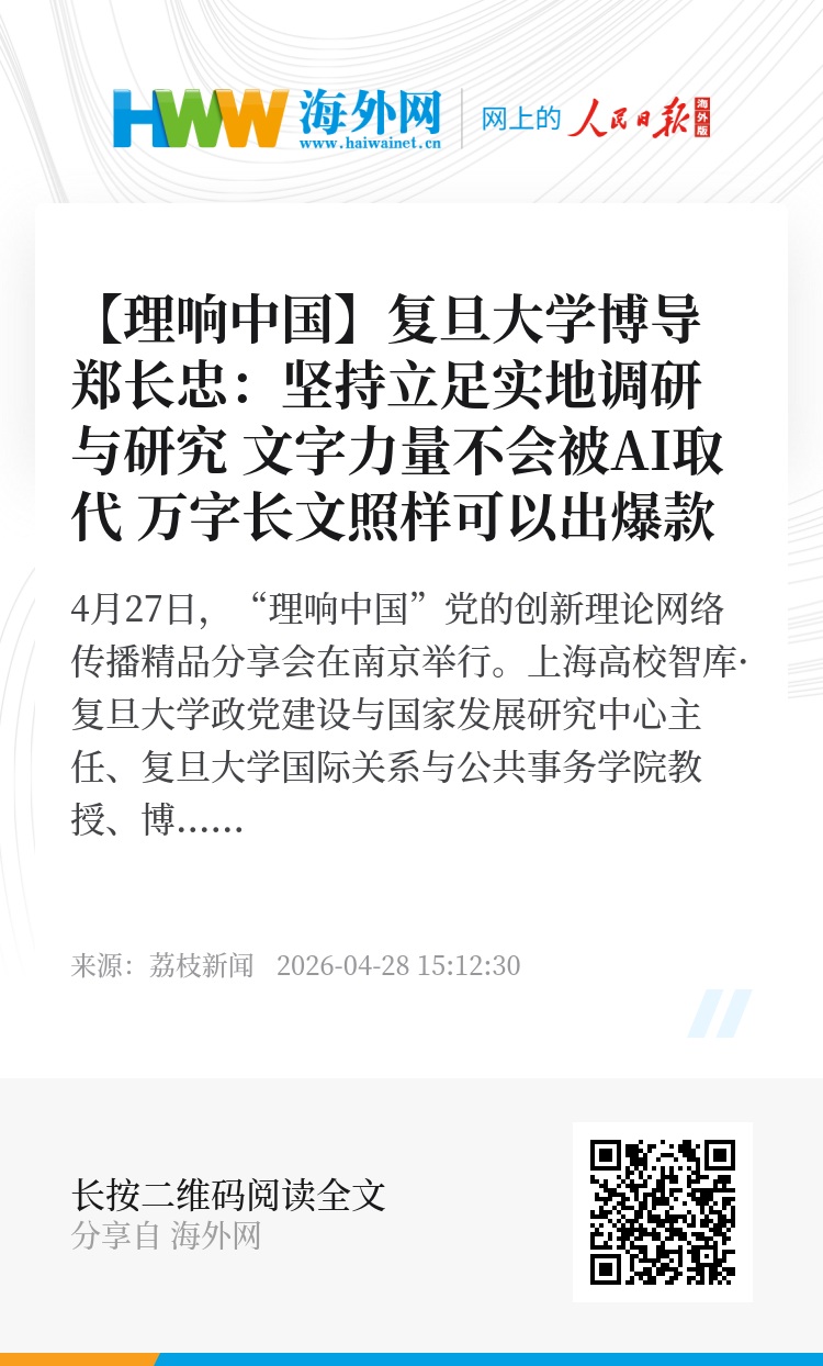 4月27日,“理响中国”党的创新理论网络传播精品分享会在南京举行。上海高校智库·复旦大学政党建设与国家发展研究中心主任、复旦大学国际关系与公共事务学院教授、博士生导师郑长忠与观众分享《短视频时代,文字依然有力量》,他称:文字的力量永远不会被AI与短视频取代,万字长文照样可以跑出反向爆款,而其中的关键不在于长短,而在于有没有扎实的调研和滚烫的实践。党的创新理论,国家重大政策,不能只靠片段传播,得有长文,把背后的底层逻辑一层层讲清楚,让大家真正看明白信得过,把大道理用家常话讲出来。