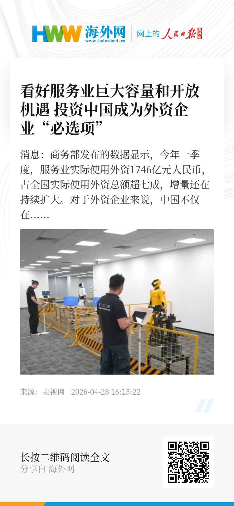 央视网消息:商务部发布的数据显示,今年一季度,服务业实际使用外资1746亿元人民币,占全国实际使用外资总额超七成,增量还在持续扩大。对于外资企业来说,中国不仅在制造业领域具备优势,也正成为服务业投资的新“蓝海”。