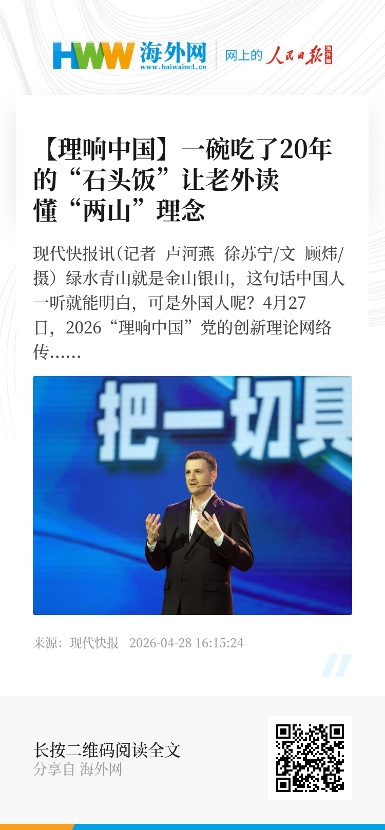 现代快报讯(记者 卢河燕 徐苏宁/文 顾炜/摄)绿水青山就是金山银山,这句话中国人一听就能明白,可是外国人呢?4月27日,2026“理响中国”党的创新理论网络传播精品分享会在江苏南京举行。中国日报美籍记者伍淡然分享了如何让老外读懂“两山”理念。