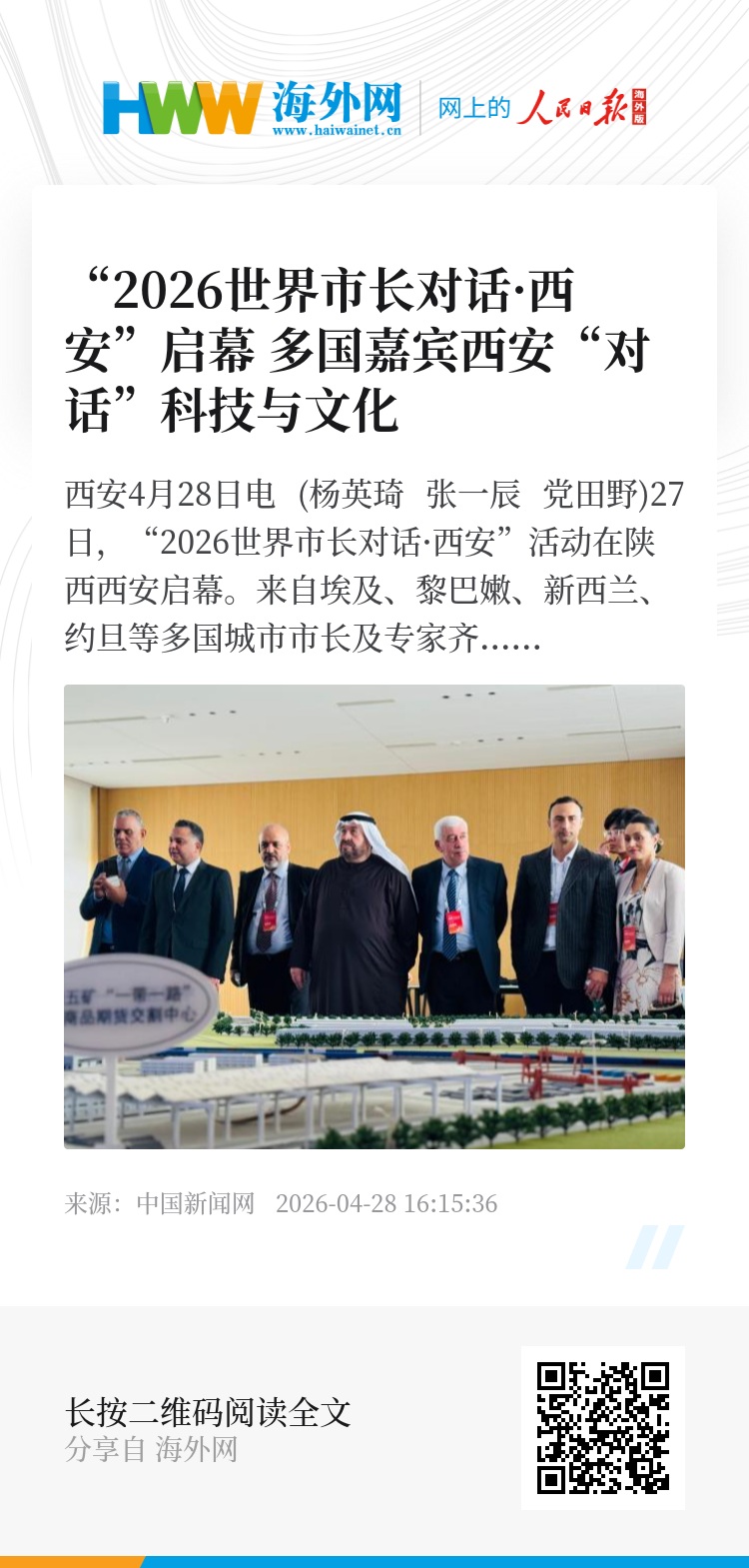 中新网西安4月28日电 (杨英琦 张一辰 党田野)27日,“2026世界市长对话·西安”活动在陕西西安启幕。来自埃及、黎巴嫩、新西兰、约旦等多国城市市长及专家齐聚古丝绸之路起点,聚焦科技与文化,共同探讨城市高质量发展的实践路径。
