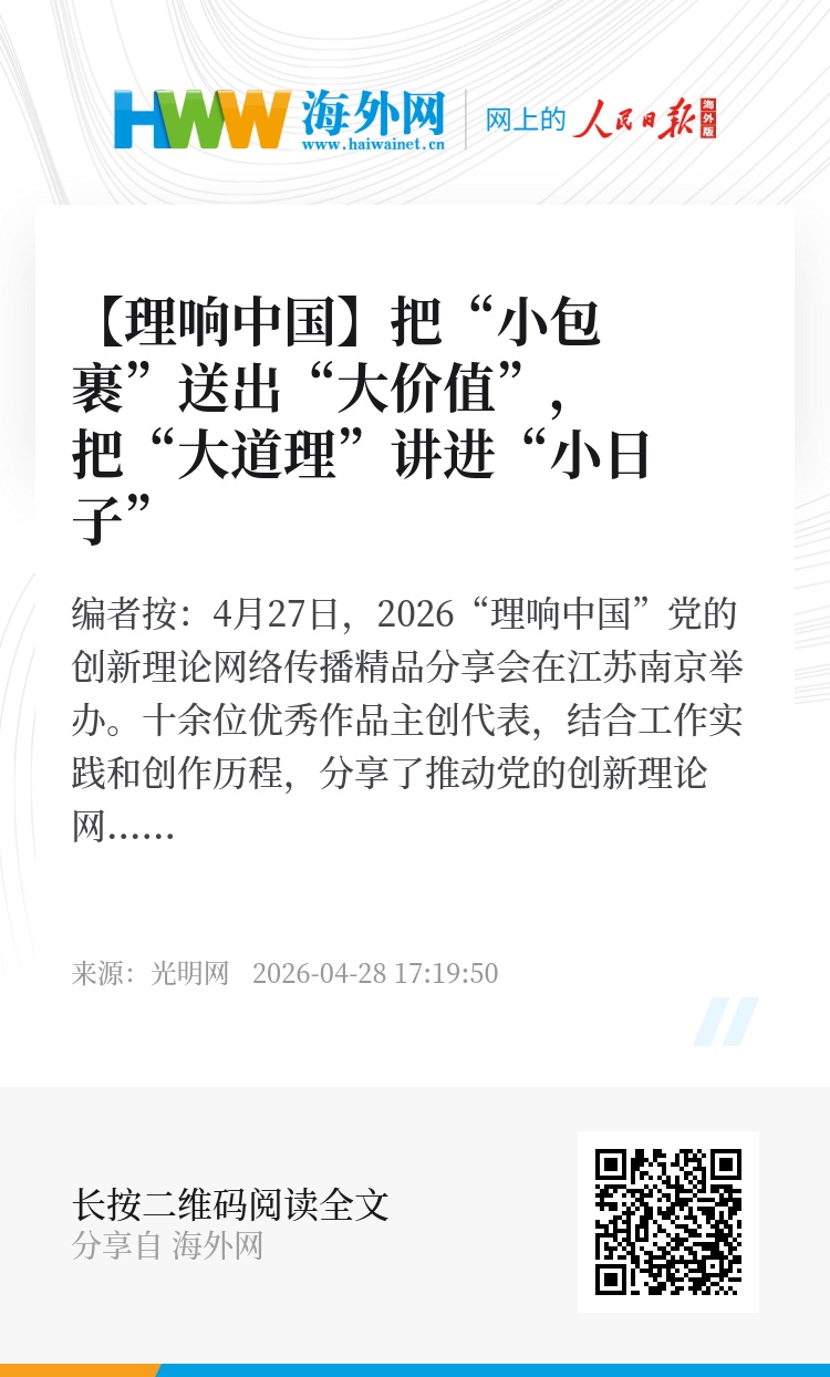 编者按:4月27日,2026“理响中国”党的创新理论网络传播精品分享会在江苏南京举办。十余位优秀作品主创代表,结合工作实践和创作历程,分享了推动党的创新理论网络传播的经验做法。光明网总裁、总编辑杨谷携手顺丰快递员肖晨,以一场“小包裹”与“大道理”的对话,展示了党的创新理论如何走进普通人的“小日子”。