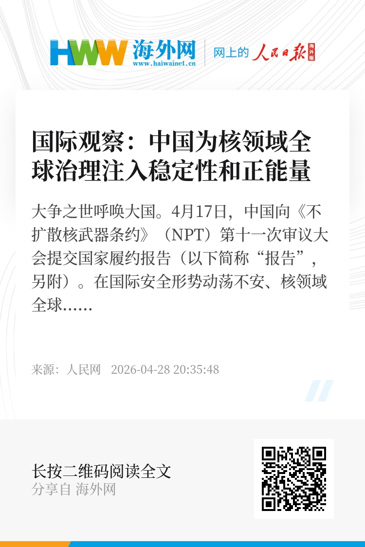 大争之世呼唤大国。4月17日,中国向《不扩散核武器条约》(NPT)第十一次审议大会提交国家履约报告(以下简称“报告”,另附)。在国际安全形势动荡不安、核领域全球治理矛盾错综复杂的背景下,中方此举是积极践行全球安全倡议、全球治理倡议的重要举措,充分体现出中国始终坚守和平追求、促进世界和平稳定的负责任大国担当。
