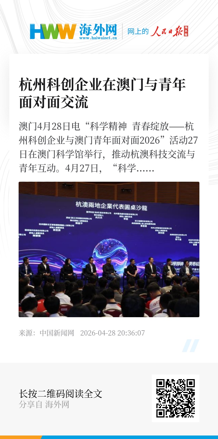 中新网澳门4月28日电 “科学精神 青春绽放——杭州科创企业与澳门青年面对面2026”活动27日在澳门科学馆举行,推动杭澳科技交流与青年互动。
