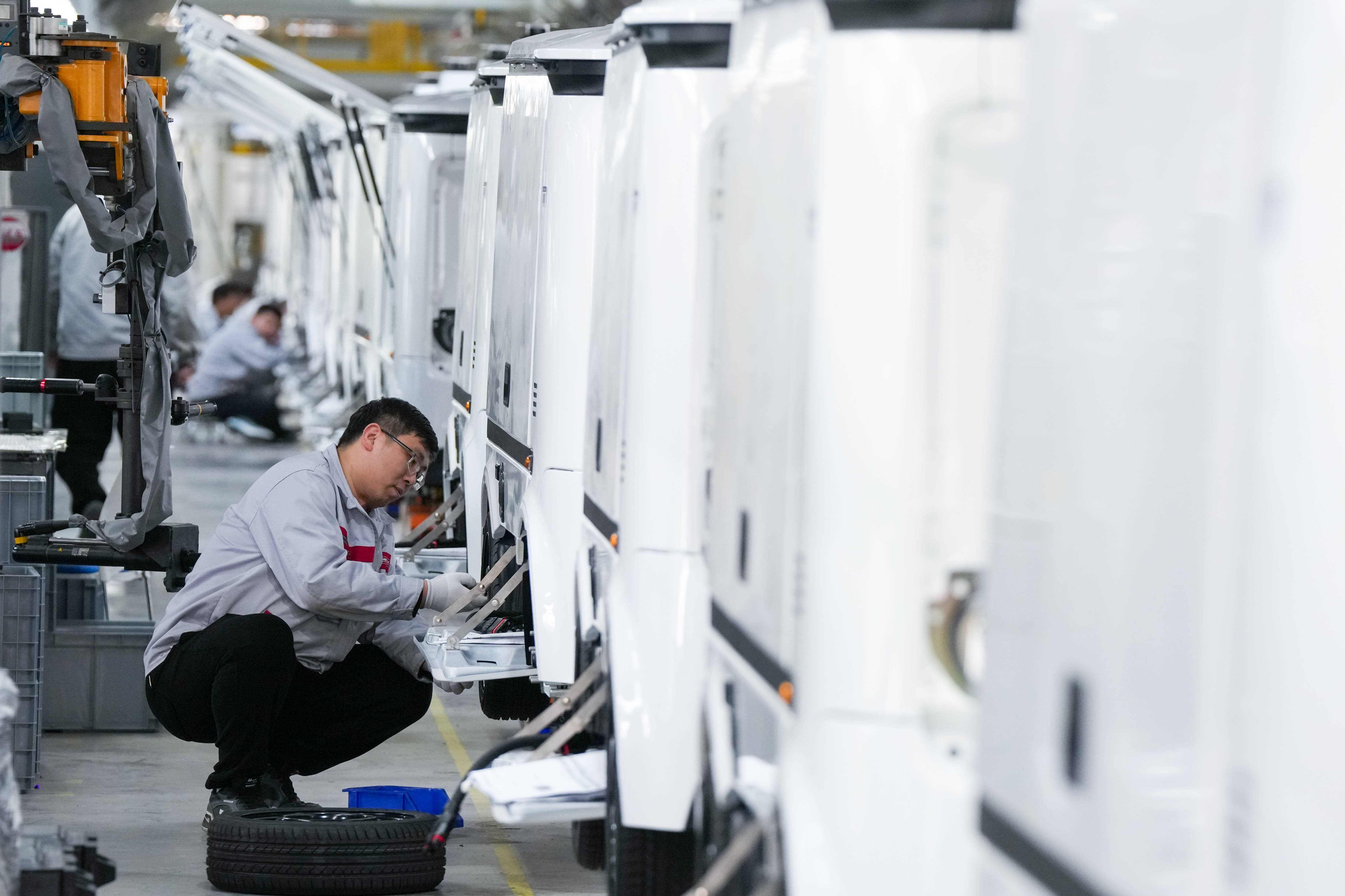 工人在新石器(盐城)智能制造有限公司无人车生产线上进行生产作业(3月25日摄)。新华社记者 李博 摄