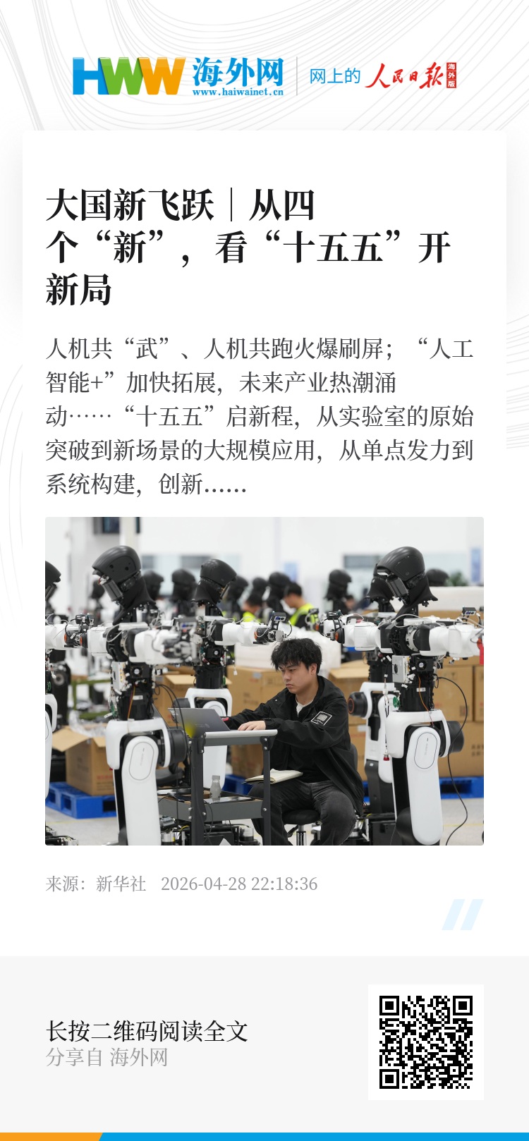 人机共“武”、人机共跑火爆刷屏;“人工智能+”加快拓展,未来产业热潮涌动……“十五五”启新程,从实验室的原始突破到新场景的大规模应用,从单点发力到系统构建,创新澎湃向前,未来正在到来。