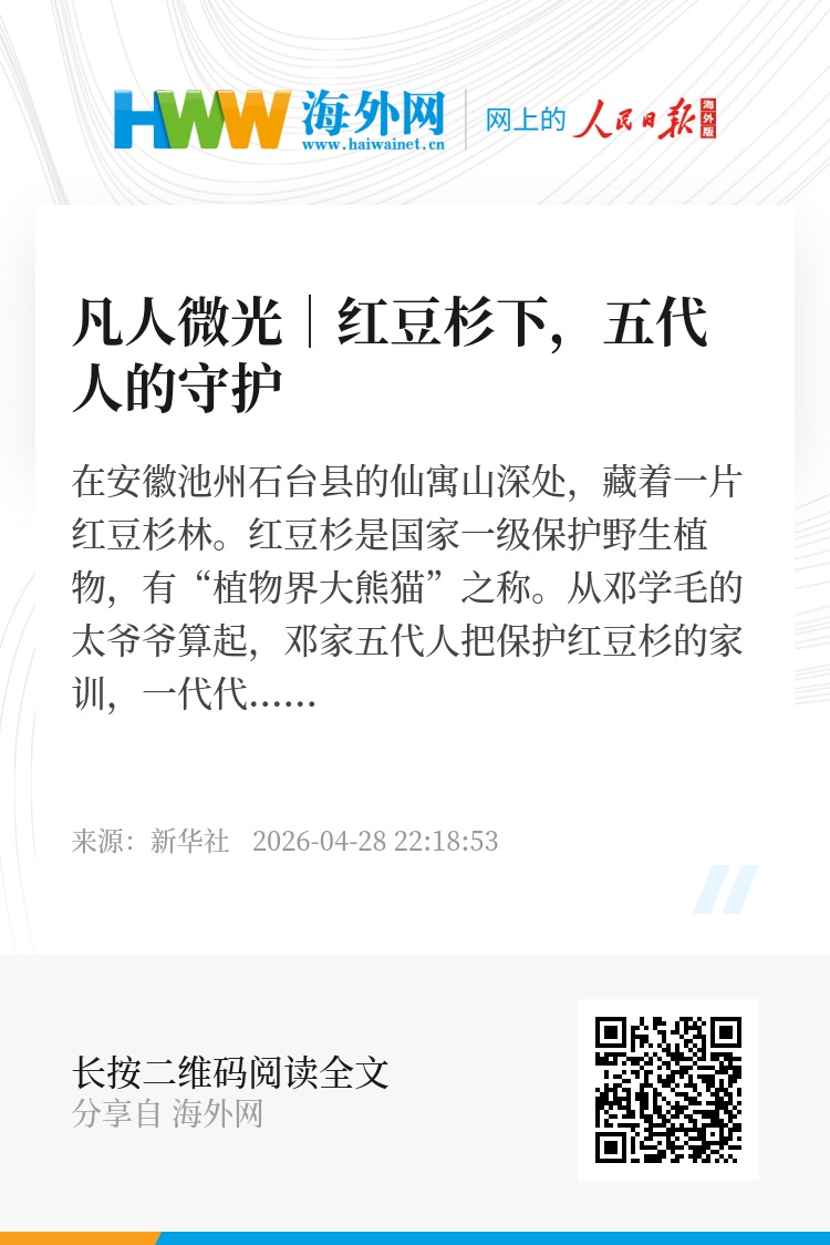 在安徽池州石台县的仙寓山深处,藏着一片红豆杉林。红豆杉是国家一级保护野生植物,有“植物界大熊猫”之称。从邓学毛的太爷爷算起,邓家五代人把保护红豆杉的家训,一代代传了下来。如今,红豆杉从最初的2棵繁衍成2000多棵的生态群落,红豆杉林成为仙寓山景区一道靓丽的风景线,村民们吃上了“旅游饭”。邓学毛说:“我今年60岁,我还干得动,要像我父亲一样干到80岁。”