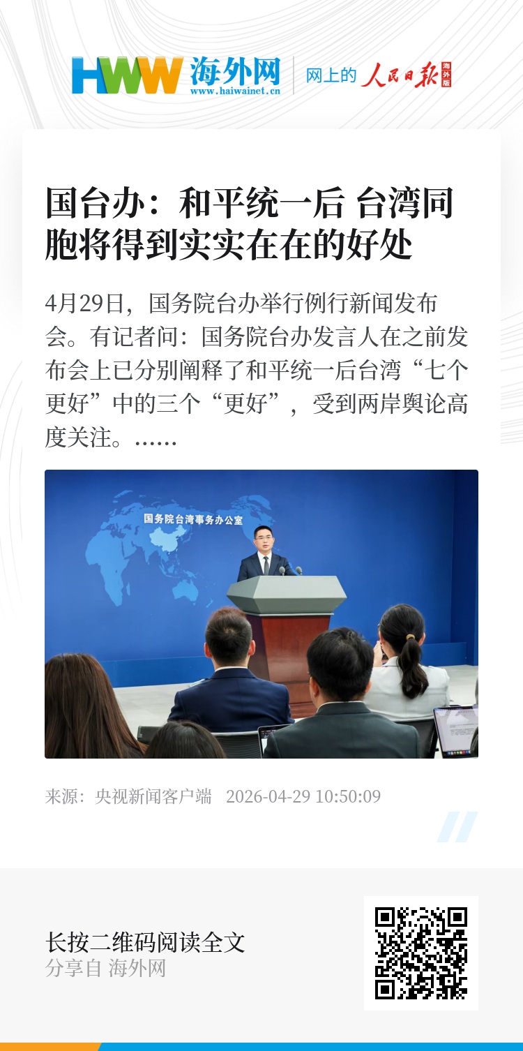 4月29日,国务院台办举行例行新闻发布会。有记者问:国务院台办发言人在之前发布会上已分别阐释了和平统一后台湾“七个更好”中的三个“更好”,受到两岸舆论高度关注。请问发言人对“和平统一后,有强大祖国做后盾,台湾经济发展会更好”有何阐释?