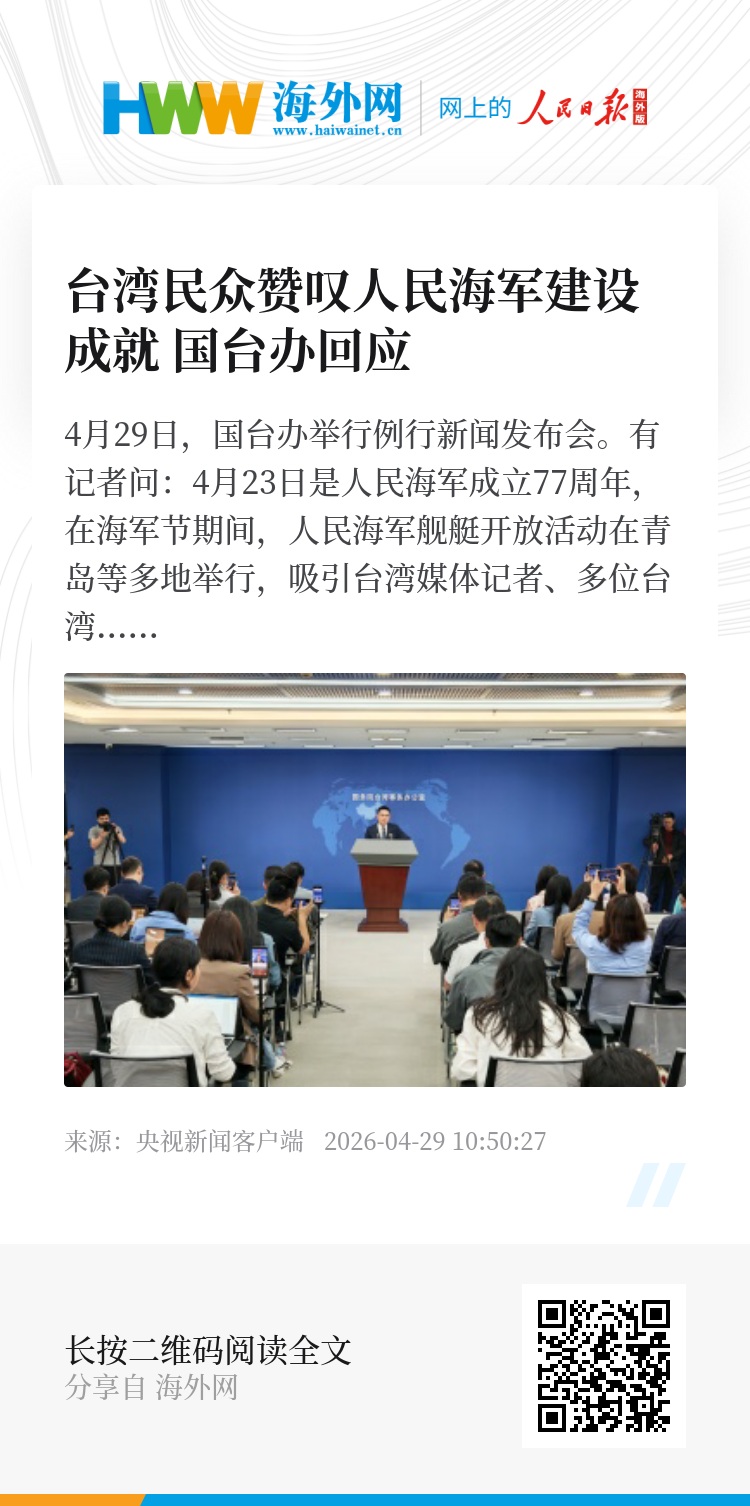 4月29日,国台办举行例行新闻发布会。有记者问:4月23日是人民海军成立77周年,在海军节期间,人民海军舰艇开放活动在青岛等多地举行,吸引台湾媒体记者、多位台湾名嘴网红和许多台湾民众参观,纷纷赞叹人民海军建设取得的成就,表示有人民军队保护台湾民众,中华民族才能不受外敌欺负。请问对此有何评论?