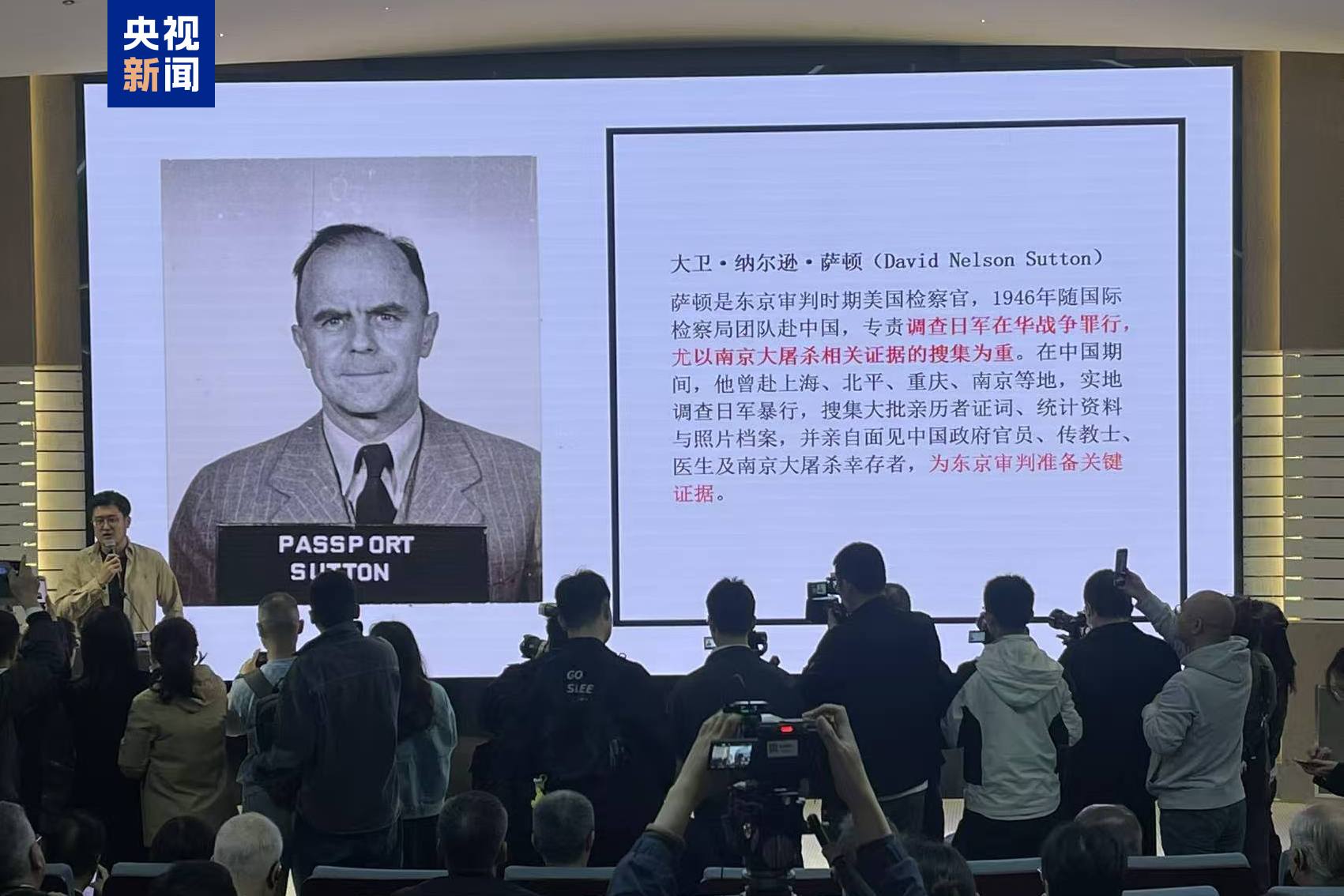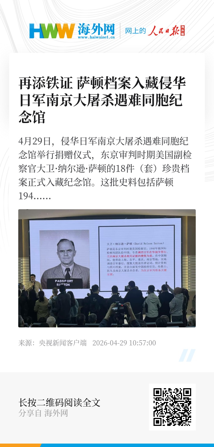 4月29日,侵华日军南京大屠杀遇难同胞纪念馆举行捐赠仪式,东京审判时期美国副检察官大卫·纳尔逊·萨顿的18件(套)珍贵档案正式入藏纪念馆。