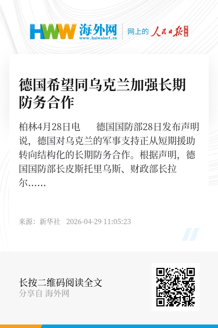 新华社柏林4月28日电 德国国防部28日发布声明说,德国对乌克兰的军事支持正从短期援助转向结构化的长期防务合作。