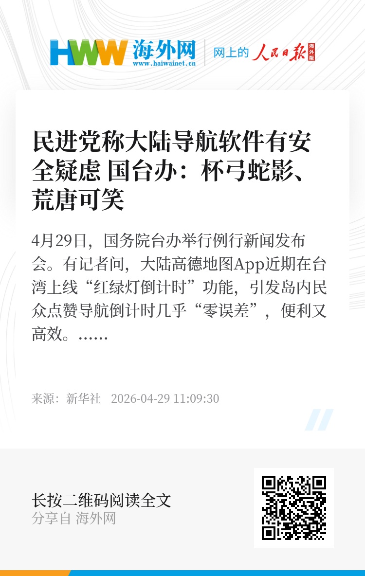 4月29日,国务院台办举行例行新闻发布会。有记者问,大陆高德地图App近期在台湾上线“红绿灯倒计时”功能,引发岛内民众点赞导航倒计时几乎“零误差”,便利又高效。民进党有人指称当中有安全疑虑,民进党当局也称,一旦确认有安全疑虑,会先要求公务部门禁止使用,并劝导民众不要使用。请问对此有何评论?