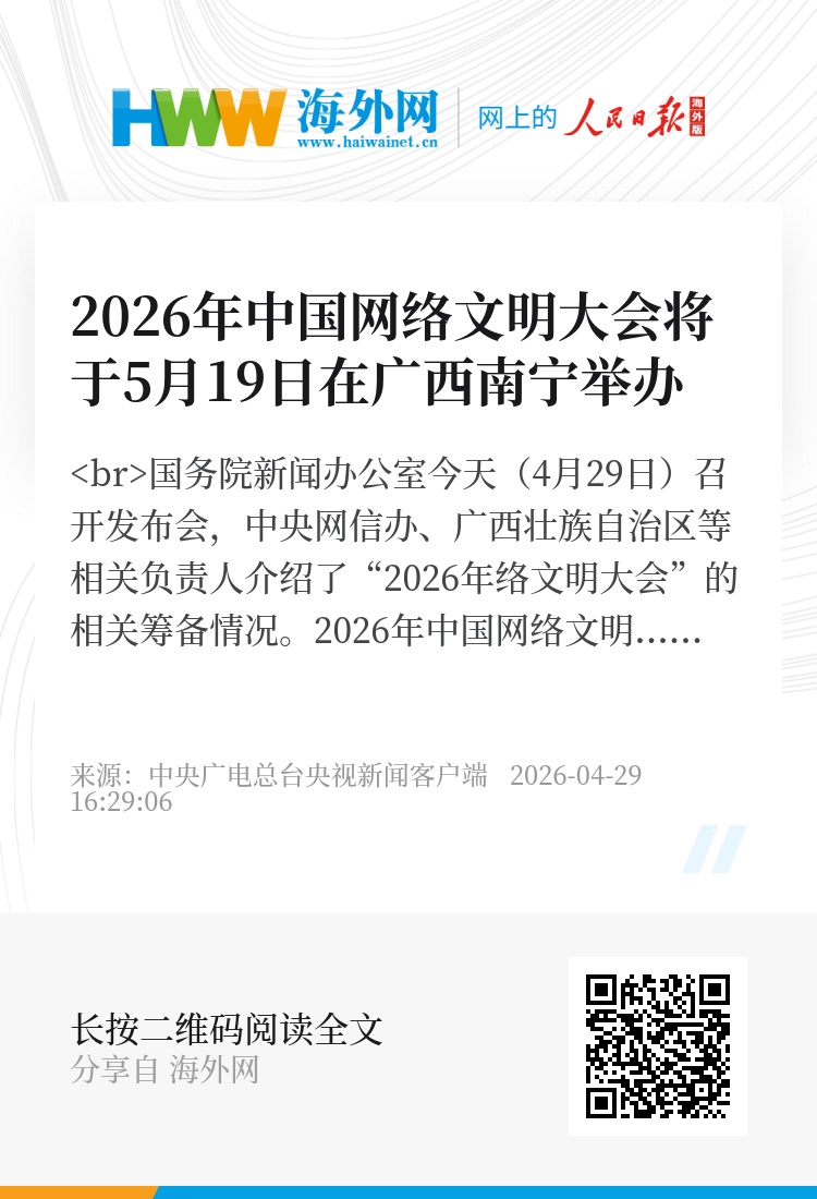 国务院新闻办公室今天(4月29日)召开发布会,中央网信办、广西壮族自治区等相关负责人介绍了“2026年中国网络文明大会”的相关筹备情况。2026年中国网络文明大会将于5月19日至20日上午在广西壮族自治区南宁市举办,会期一天半,主题为“文明网络空间 昂扬奋进力量”。