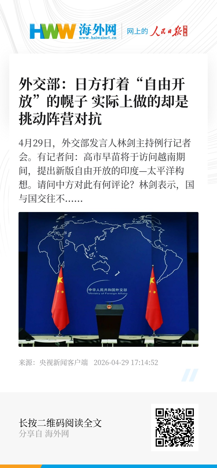4月29日,外交部发言人林剑主持例行记者会。有记者问:高市早苗将于访问越南期间,提出新版自由开放的印度—太平洋构想。请问中方对此有何评论?