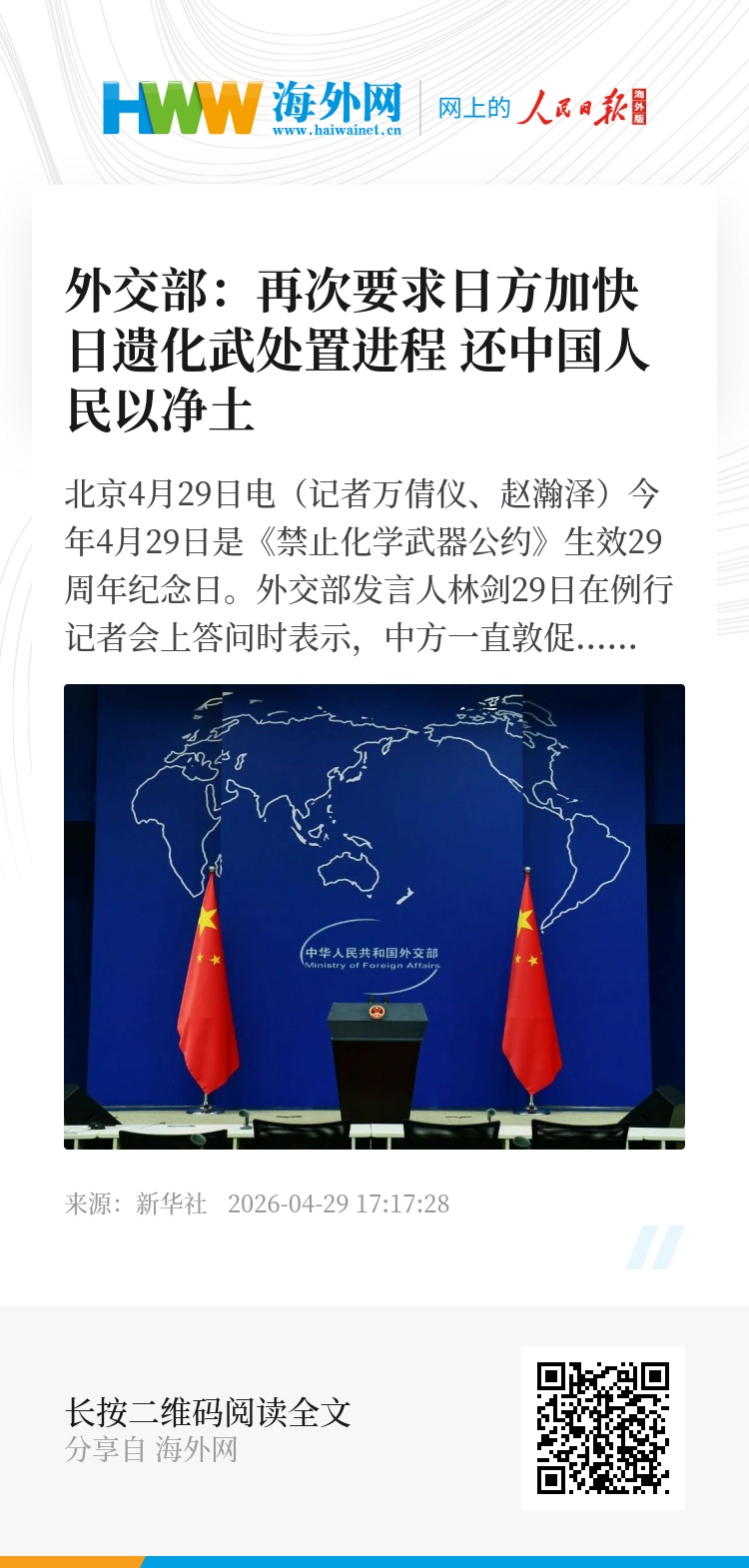 新华社北京4月29日电(记者万倩仪、赵瀚泽)今年4月29日是《禁止化学武器公约》生效29周年纪念日。外交部发言人林剑29日在例行记者会上答问时表示,中方一直敦促日方按照《禁止化学武器公约》和中日政府备忘录规定,早日全面彻底销毁日遗化武。