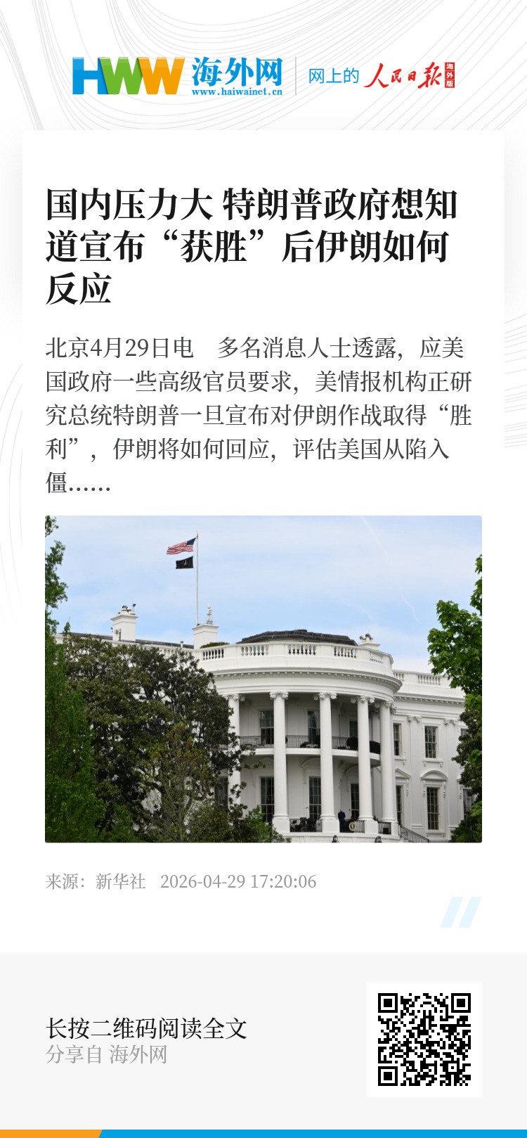 新华社北京4月29日电 多名消息人士透露,应美国政府一些高级官员要求,美情报机构正研究总统特朗普一旦宣布对伊朗作战取得“胜利”,伊朗将如何回应,评估美国从陷入僵局的战事中抽身会引发何种后果。