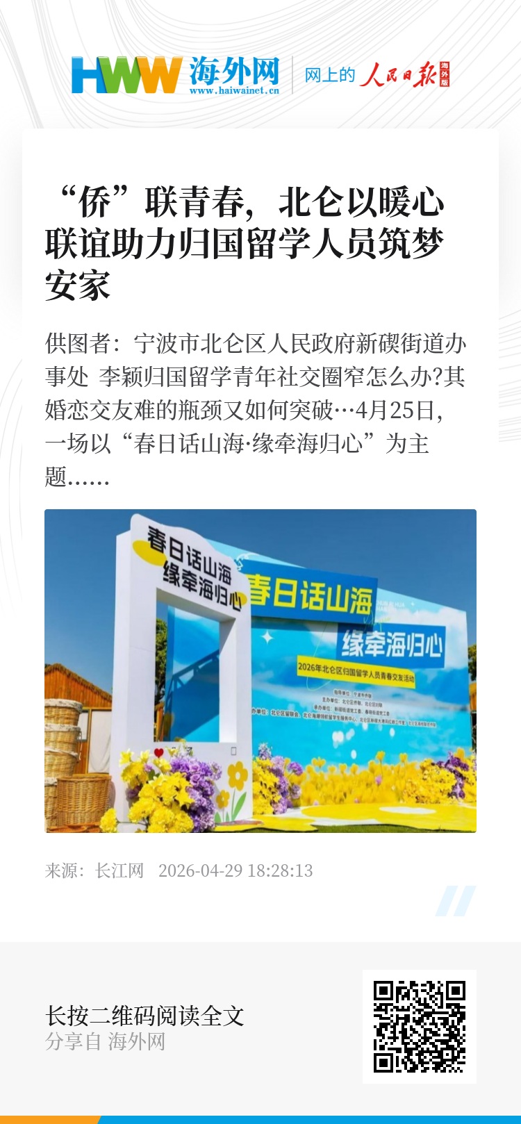 归国留学青年社交圈窄怎么办?其婚恋交友难的瓶颈又如何突破···4月25日,一场以“春日话山海·缘牵海归心”为主题的2026年北仑区归国留学人员青春交友活动在梅山湾温情启幕,吸引了50余名曾远赴山海求学,如今扎根北仑干事逐梦的归国留学青年齐聚,在松弛浪漫的氛围中邂逅美好缘分、畅谈理想抱负,以沉浸式联谊搭建交流纽带,为人才扎根注入暖心动能。