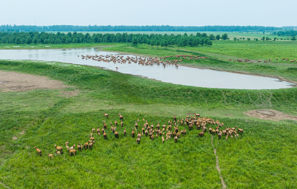 2023年5月19日,麋鹿在湖北石首麋鹿国家级自然保护区内活动(无人机照片)。伴随生态环境改善,在湖北石首麋鹿国家级自然保护区、神农架林区等多个生态屏障区,麋鹿、金丝猴等野生动物种群数量大幅增长。