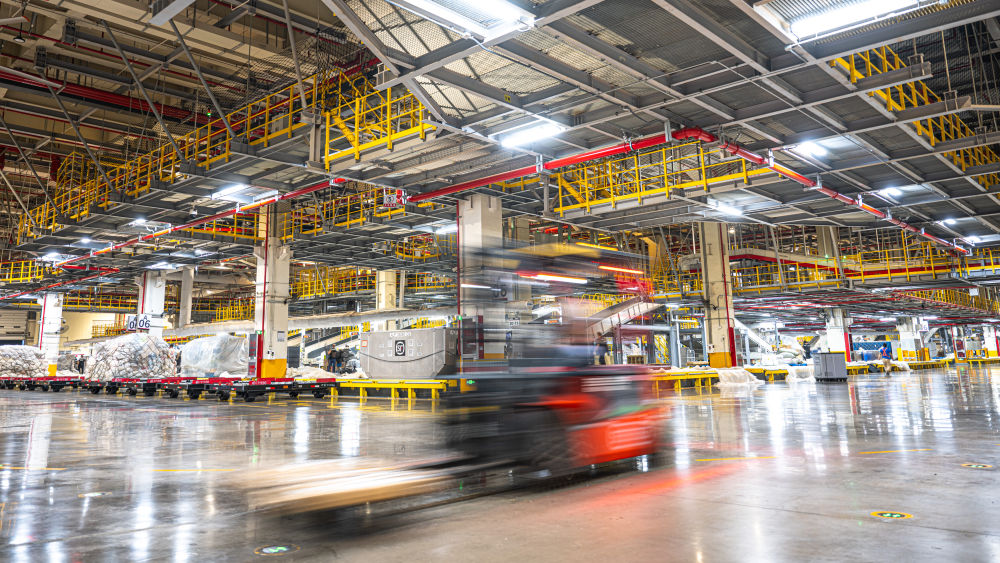 这是2025年7月11日凌晨拍摄的湖北鄂州花湖国际机场转运中心内景。于2022年7月建成投运的鄂州花湖国际机场,是湖北打造国内大循环节点和国内国际双循环战略链接的重要支撑。依托铁水联运专用线,武汉阳逻港可连接中欧班列与鄂州花湖国际机场,服务范围覆盖120多个国家和地区200余个城市。
