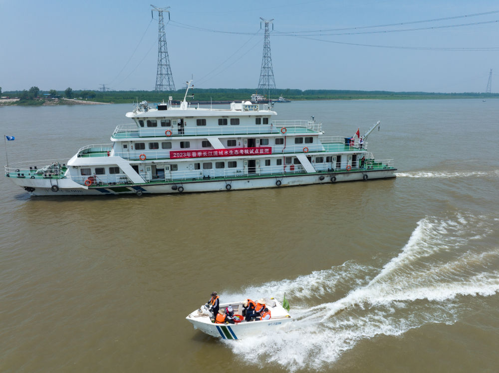 2023年5月12日,在湖北省赤壁市江段,来自长江流域生态环境监督管理局等单位的监测人员乘坐小艇前往监测点位,为长江水生态“体检”(无人机照片)。