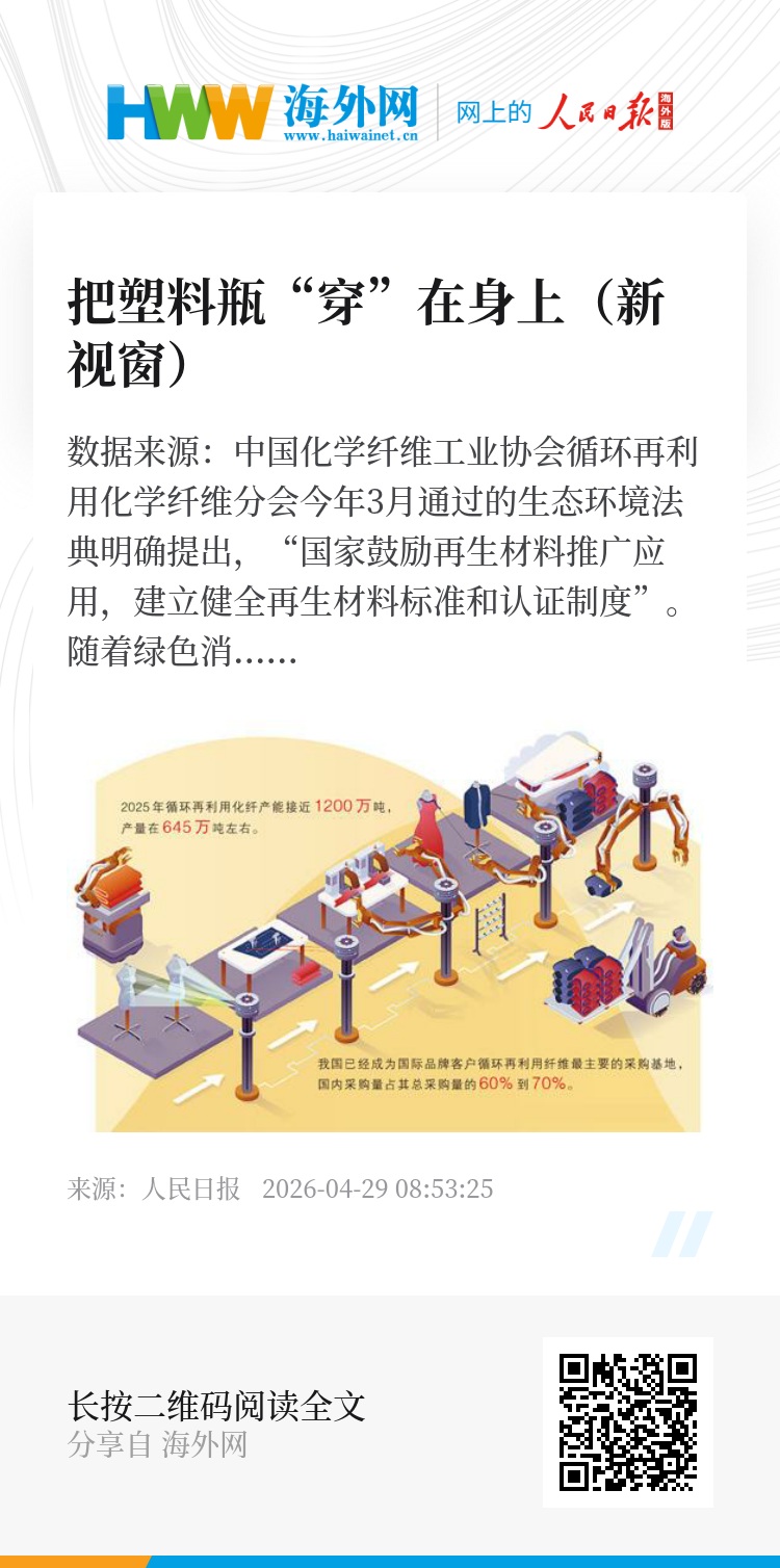 展望未来,聚酯纤维凭借高性价比和可改性优势,仍将占据服装材料的主流地位。全球再生聚酯市场预计到2033年超150亿美元,中国将继续占据重要份额,并引领技术方向。从服装到汽车内饰、家居纺织品、绝缘材料,再生聚酯纤维的应用场景在加速拓展。(齐志明 苏咏潇)