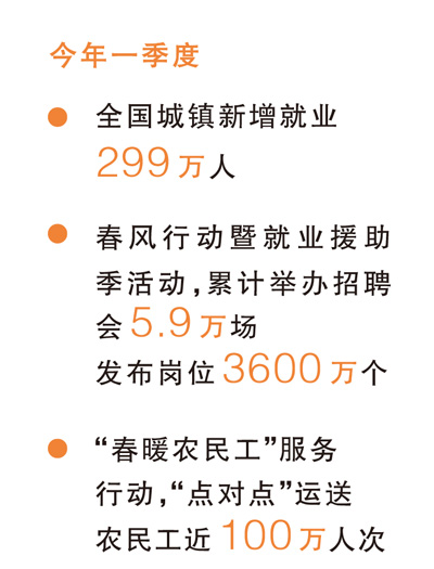 今年一季度,全国城镇新增就业299万人,就业形势保持总体稳定。人力资源社会保障部会同有关部门印发《关于统筹城乡就业政策体系的意见》。加大惠企利民政策落实力度,发放失业保险稳岗返还资金31亿元、一次性扩岗补助5亿元、技能提升补贴8亿元。