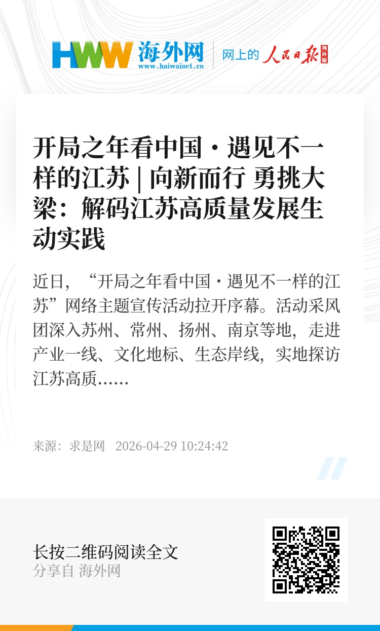 近日,“开局之年看中国・遇见不一样的江苏”网络主题宣传活动拉开序幕。活动采风团深入苏州、常州、扬州、南京等地,走进产业一线、文化地标、生态岸线,实地探访江苏高质量发展的生动实践。迈入“十五五”开局之年,江苏这片热土承古开今、向新而行,以推进高质量发展的扎实行动挑起“大梁之责”、蓄积“开局之势”。