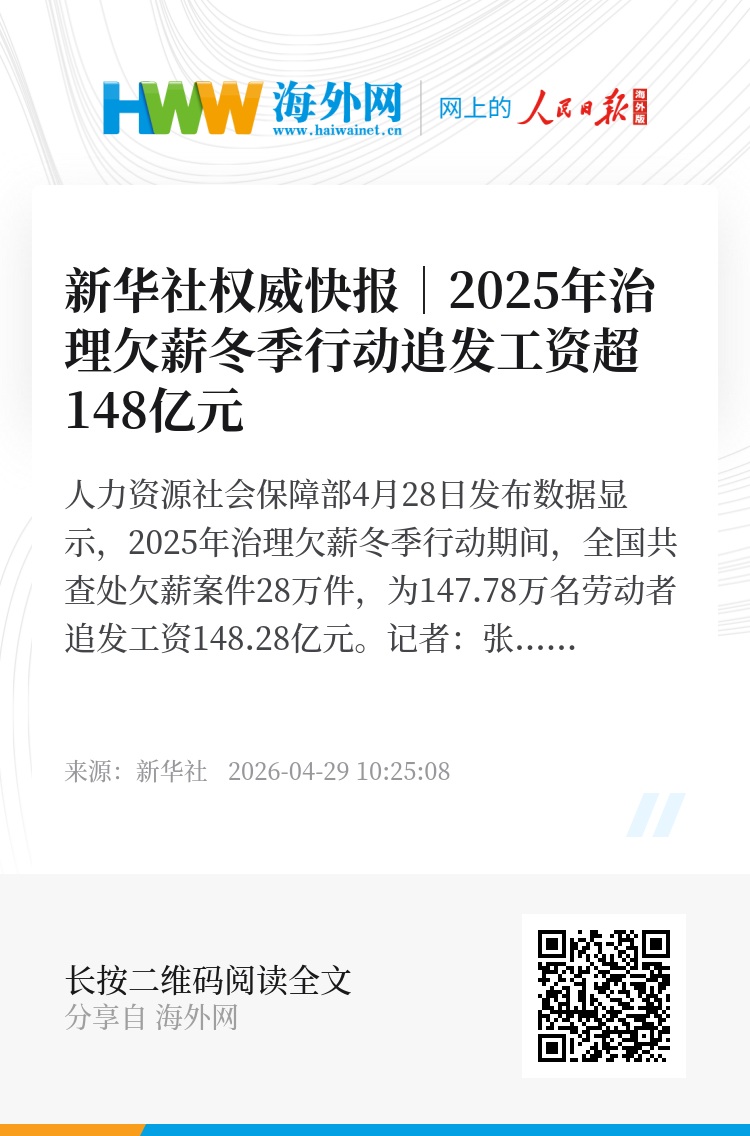 人力资源社会保障部4月28日发布数据显示,2025年治理欠薪冬季行动期间,全国共查处欠薪案件28万件,为147.78万名劳动者追发工资148.28亿元。
