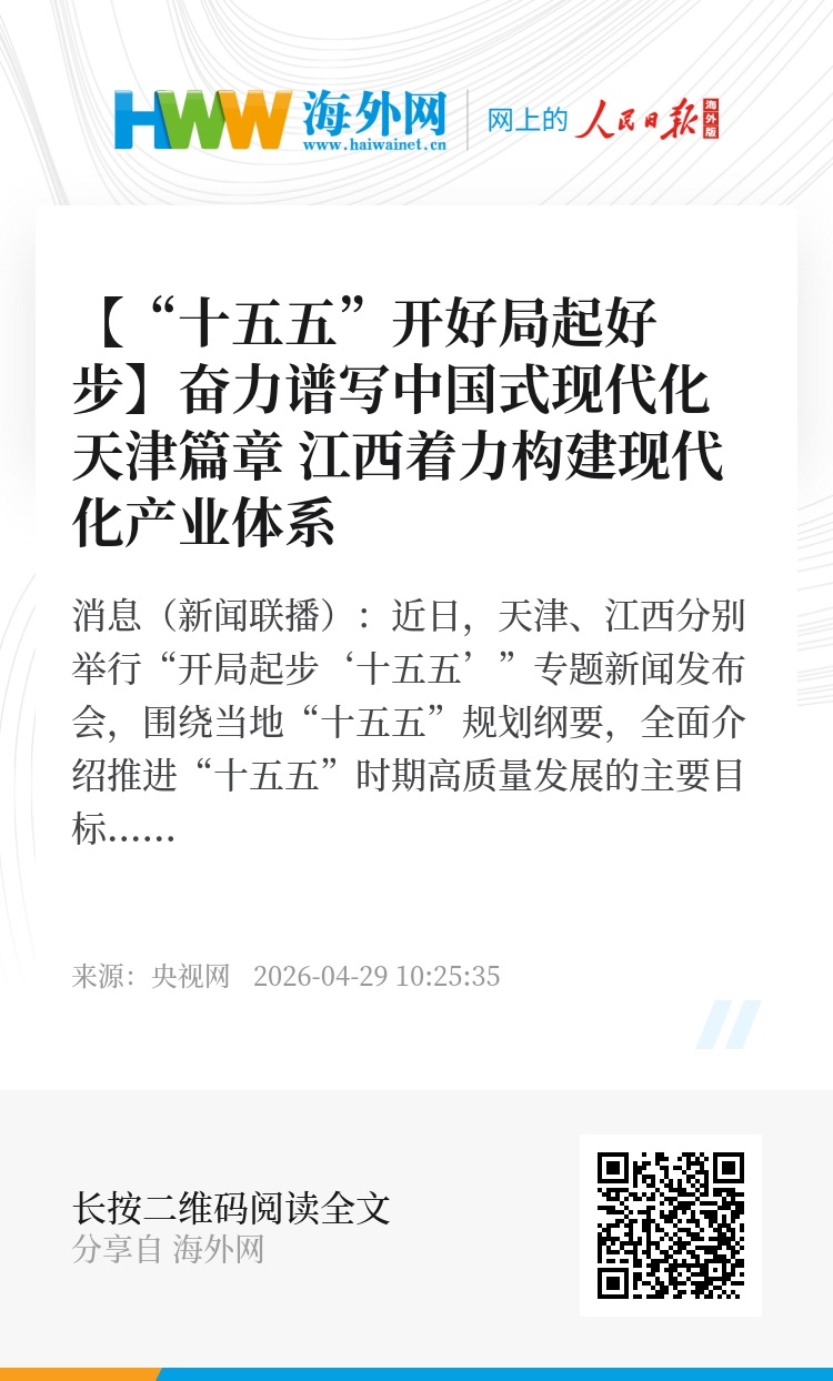 央视网消息(新闻联播):近日,天津、江西分别举行“开局起步‘十五五’”专题新闻发布会,围绕当地“十五五”规划纲要,全面介绍推进“十五五”时期高质量发展的主要目标和重大任务。