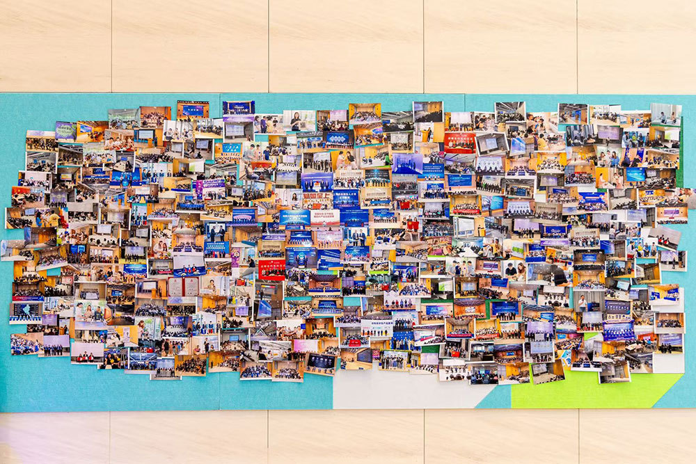 “模速空间”内部的照片墙,展示为AI企业举办的各类活动。受访者供图
