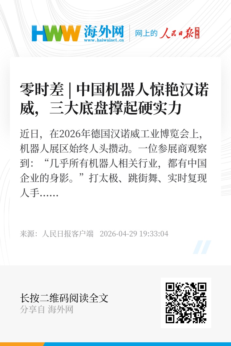 近日,在2026年德国汉诺威工业博览会上,机器人展区始终人头攒动。一位参展商观察到:“几乎所有机器人相关行业,都有中国企业的身影。”打太极、跳街舞、实时复现人手动作……中国机器人动作丝滑、反应灵敏,成为全场最受关注的亮点。