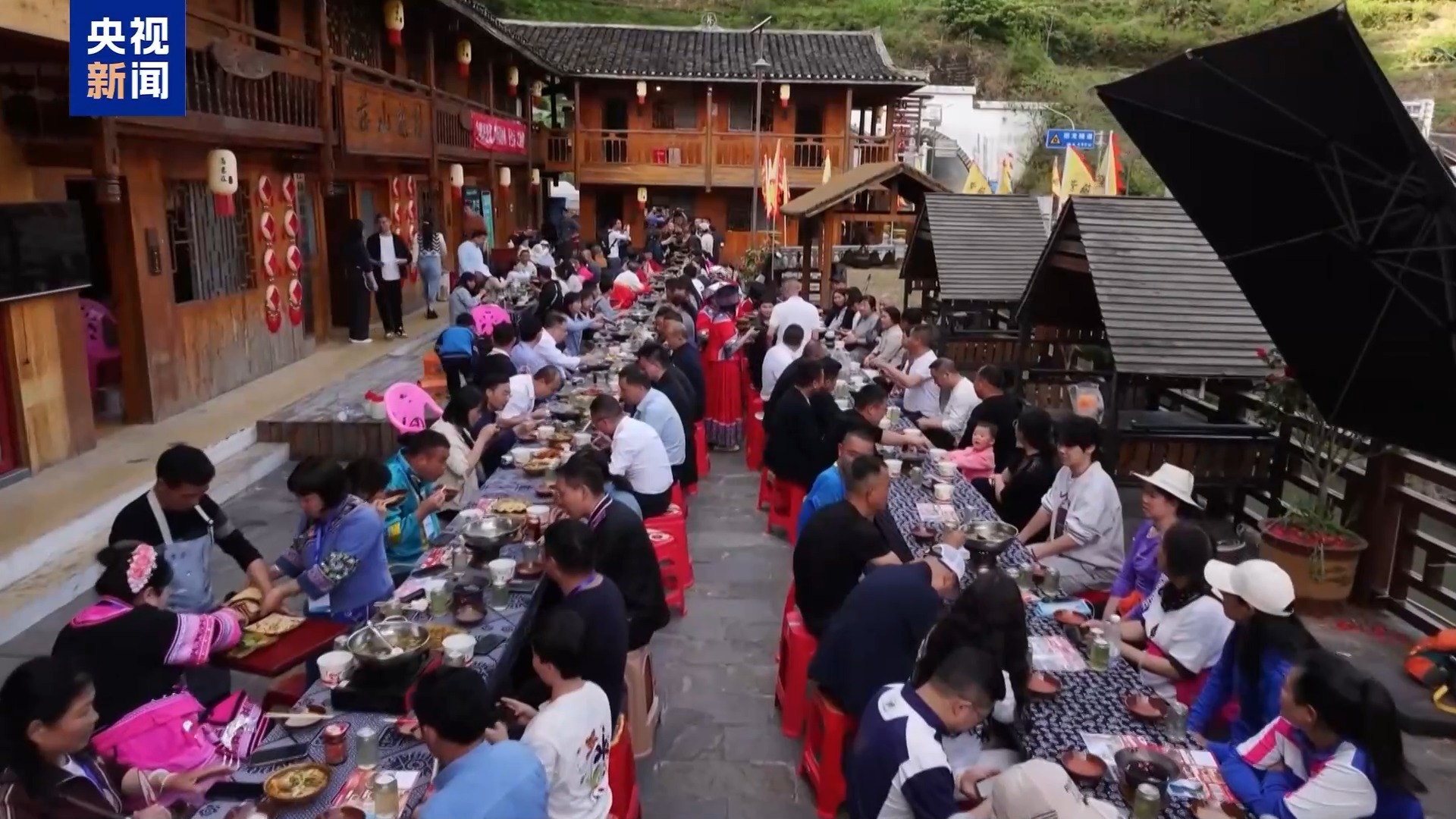 在贵州铜仁梵净山下的团龙村,热闹非凡的土家长桌宴这两天也欢乐开席,宴席上,米酒搭配天麻鸡、土家腊肉等地道乡土美食,尽显土家饮食文化的独特韵味。来自全国各地的游客围坐长桌旁,在品尝美食的同时,尽情领略传统村落的生态之美。