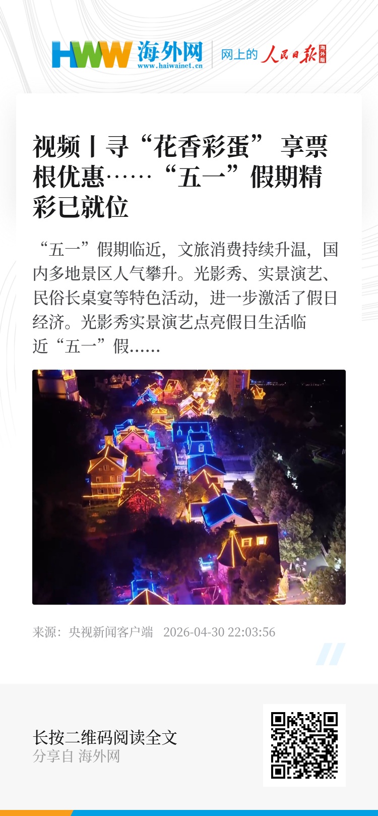 “五一”假期临近,文旅消费持续升温,国内多地景区人气攀升。光影秀、实景演艺、民俗长桌宴等特色活动,进一步激活了假日经济。