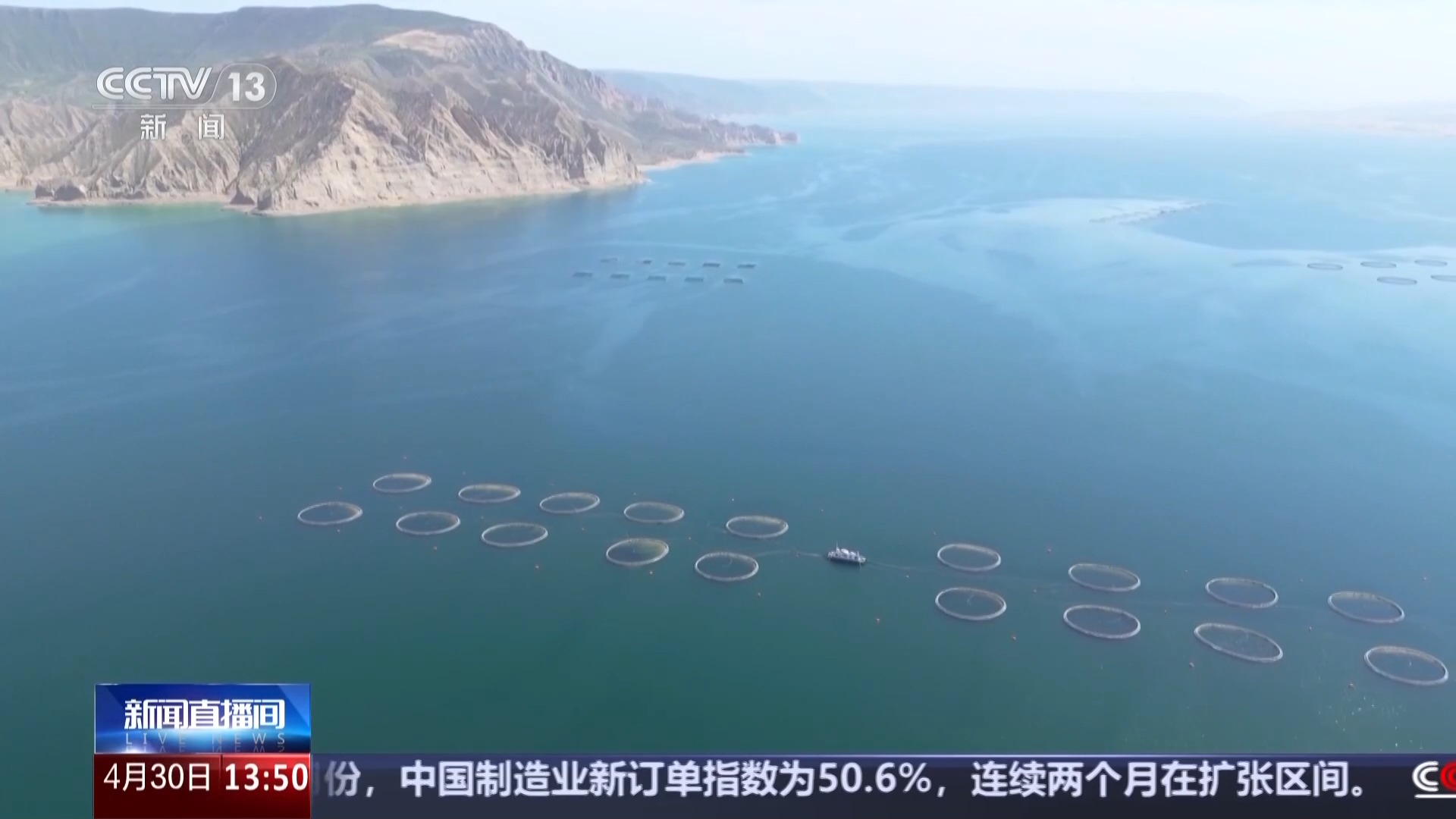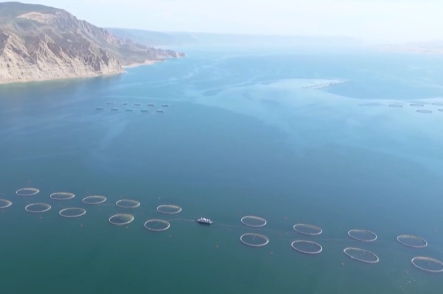 总台央视记者 孔令雯:群山怀抱的龙羊峡水库海拔2600米,位于黄河上游,来自冰川、雪山的融水,全年平均水温稳定在12℃左右,并且常年不封冻,养殖区平均水深120米,优渥的环境条件让这里出产的虹鳟鱼品质出众,现在这个季节每天有50吨左右的虹鳟鱼从这里出发,送往国内外消费者的餐桌。