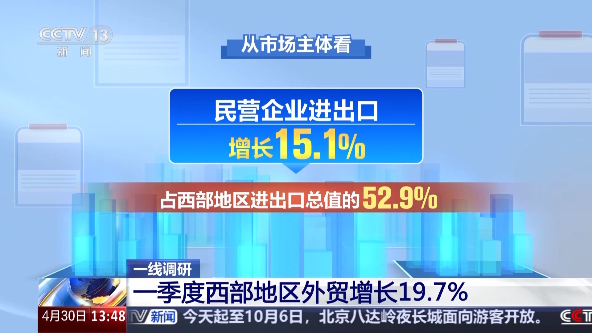 从市场主体看,西部地区各经营主体均保持增长。民营企业进出口增长15.1%,占西部地区进出口总值的52.9%。外商投资企业、国有企业进出口分别增长31.4%、13.1%。