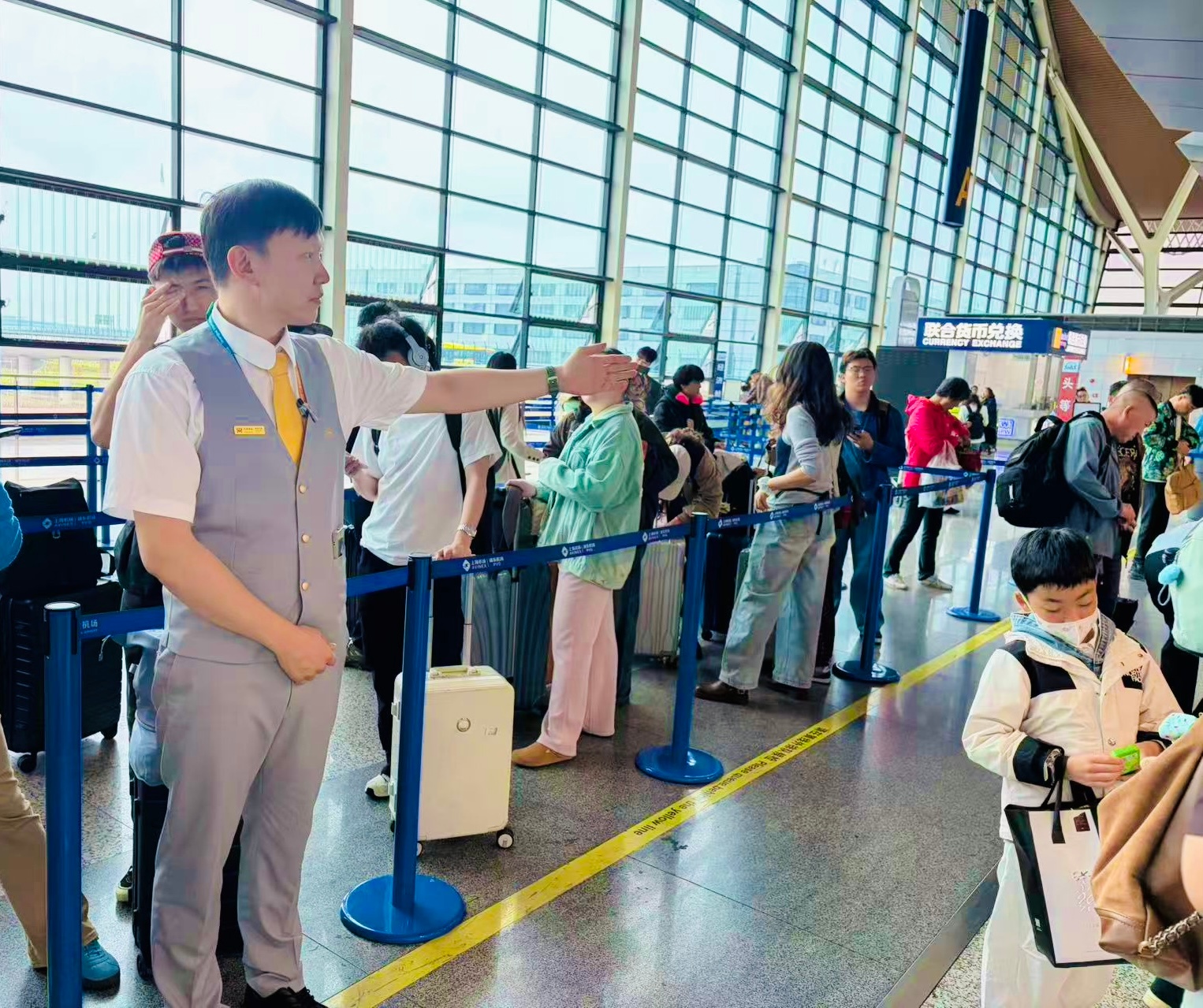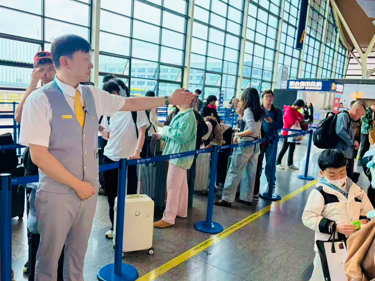 “五一”假期将至,海南航空地服人员为旅客提供引导服务