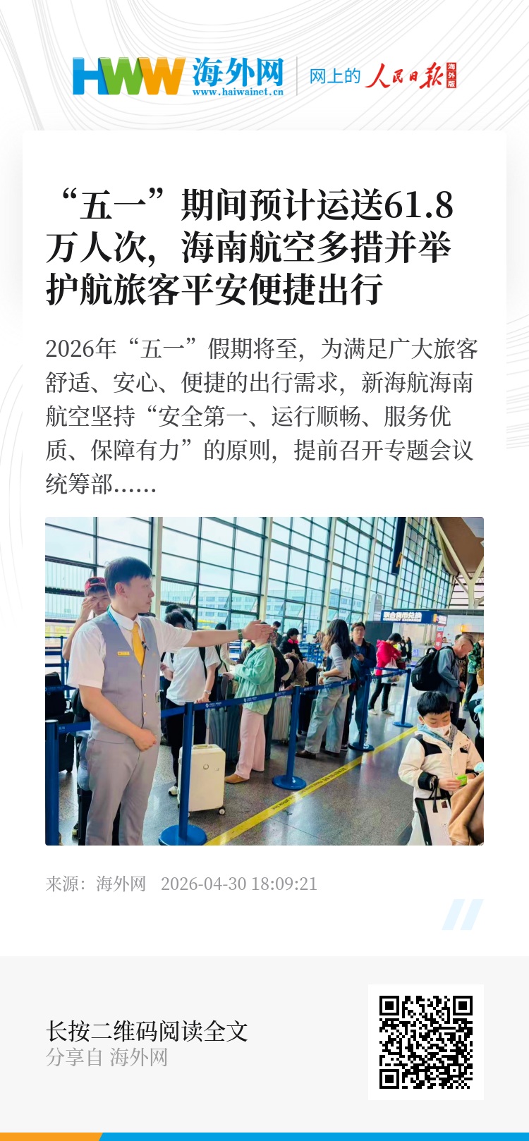 海南航空以高度的责任担当与过硬的保障能力,用心守护广大旅客“五一”假期平安、舒心、便捷出行。作为中国内地唯一一家SKYTRAX五星航空公司,海南航空将持续筑牢安全底线,深入践行“真情服务”理念,持续深耕服务品质,创新服务产品,以专业、暖心、高效的五星航空服务,全力保障每一位旅客的出行体验,用优质服务守护旅客的每一段美好旅途。(杨映娟、王影、张颖 作者单位:海南航空控股股份有限公司)