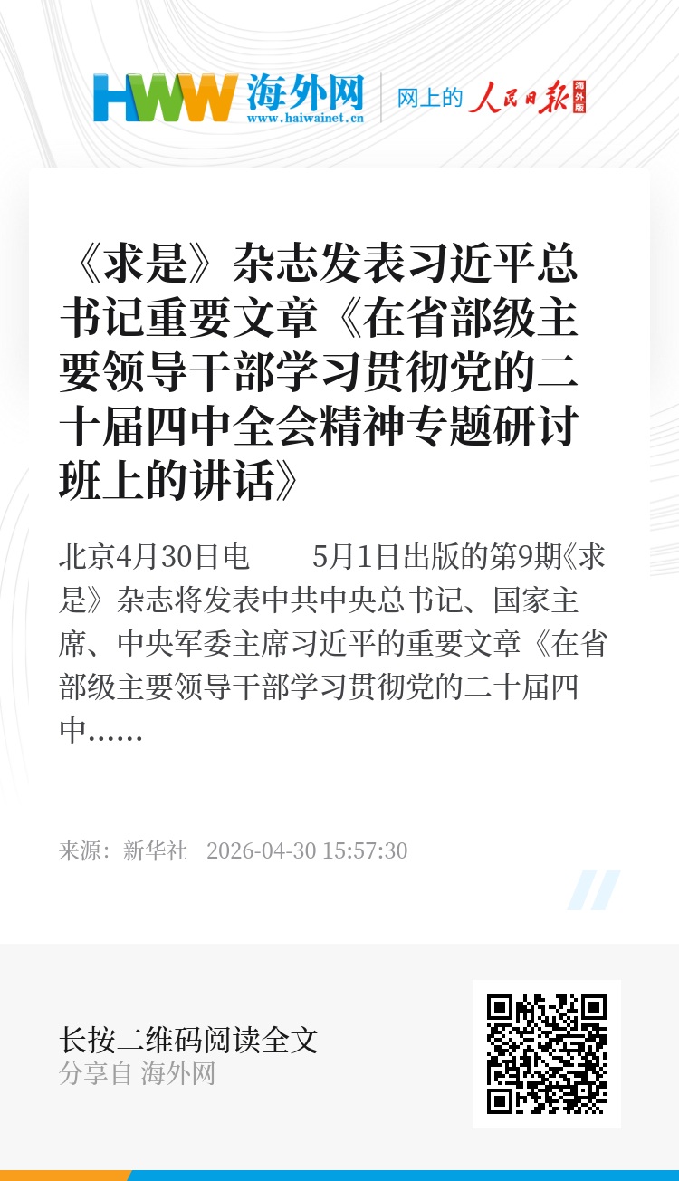 新华社北京4月30日电 5月1日出版的第9期《求是》杂志将发表中共中央总书记、国家主席、中央军委主席习近平的重要文章《在省部级主要领导干部学习贯彻党的二十届四中全会精神专题研讨班上的讲话》。