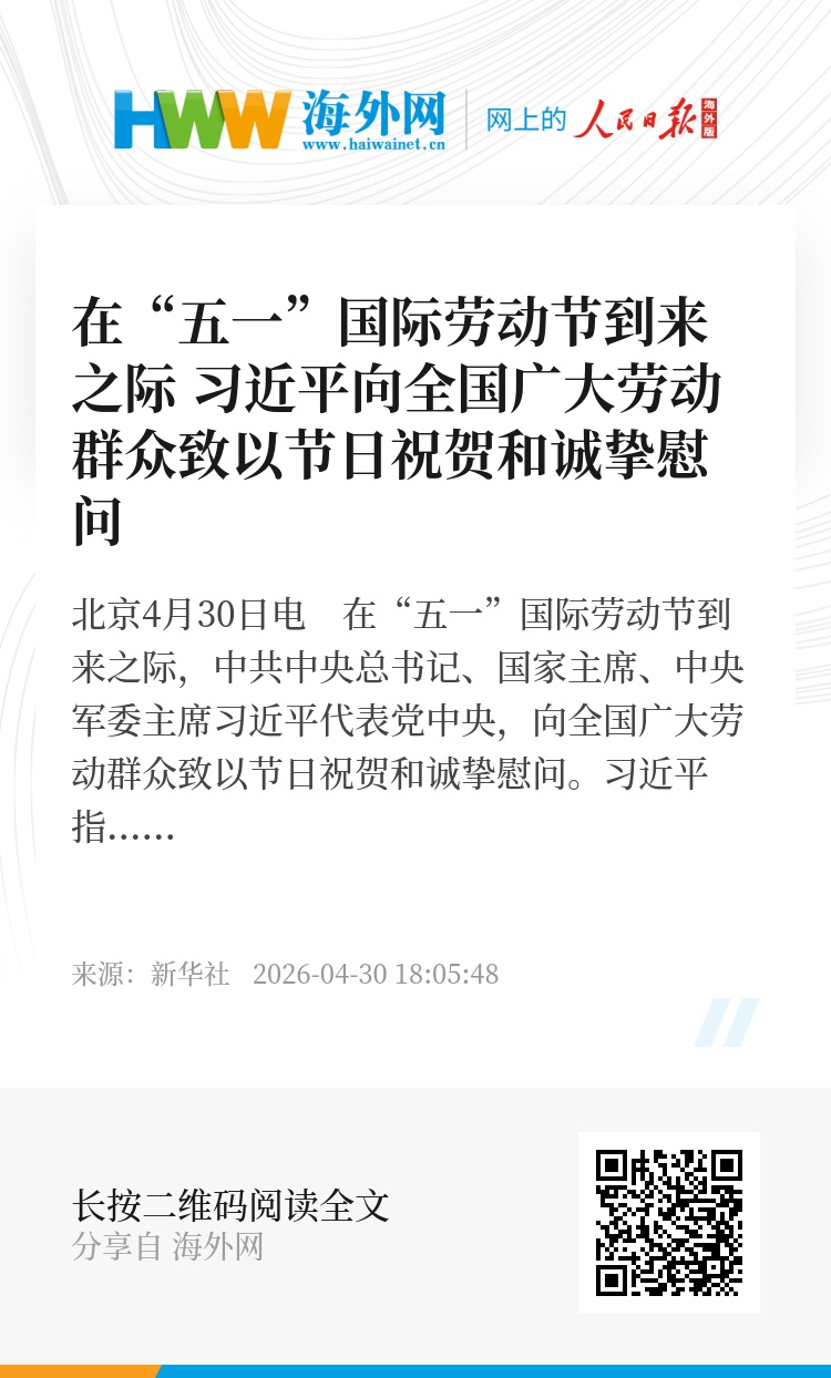 新华社北京4月30日电 在“五一”国际劳动节到来之际,中共中央总书记、国家主席、中央军委主席习近平代表党中央,向全国广大劳动群众致以节日祝贺和诚挚慰问。