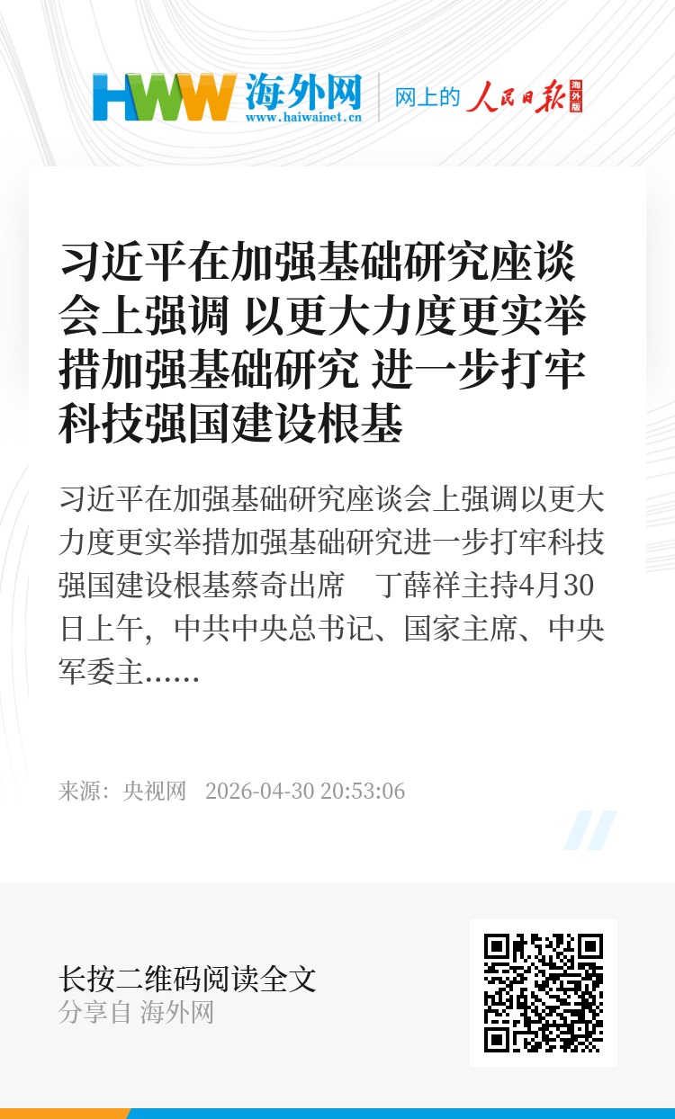 4月30日上午,中共中央总书记、国家主席、中央军委主席习近平在上海出席加强基础研究座谈会并发表重要讲话。