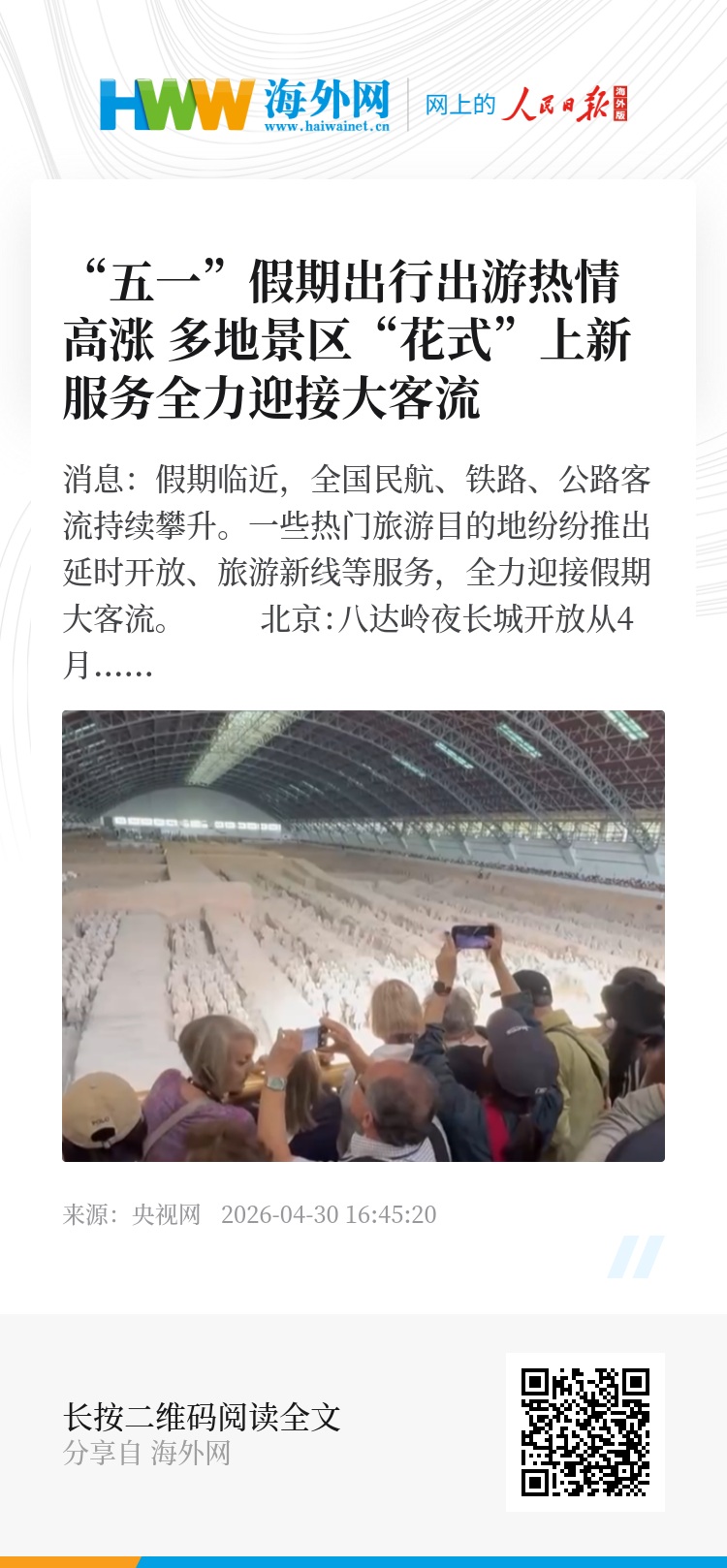 央视网消息:假期临近,全国民航、铁路、公路客流持续攀升。一些热门旅游目的地纷纷推出延时开放、旅游新线等服务,全力迎接假期大客流。