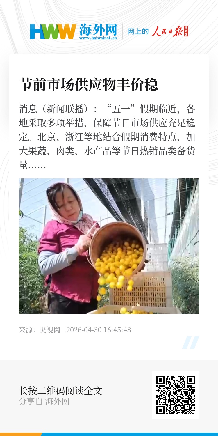 央视网消息(新闻联播):“五一”假期临近,各地采取多项举措,保障节日市场供应充足稳定。北京、浙江等地结合假期消费特点,加大果蔬、肉类、水产品等节日热销品类备货量,确保网点供应充足。广东、江西等地联动500多家重点批发市场和超市,加强产销衔接,丰富商品种类。