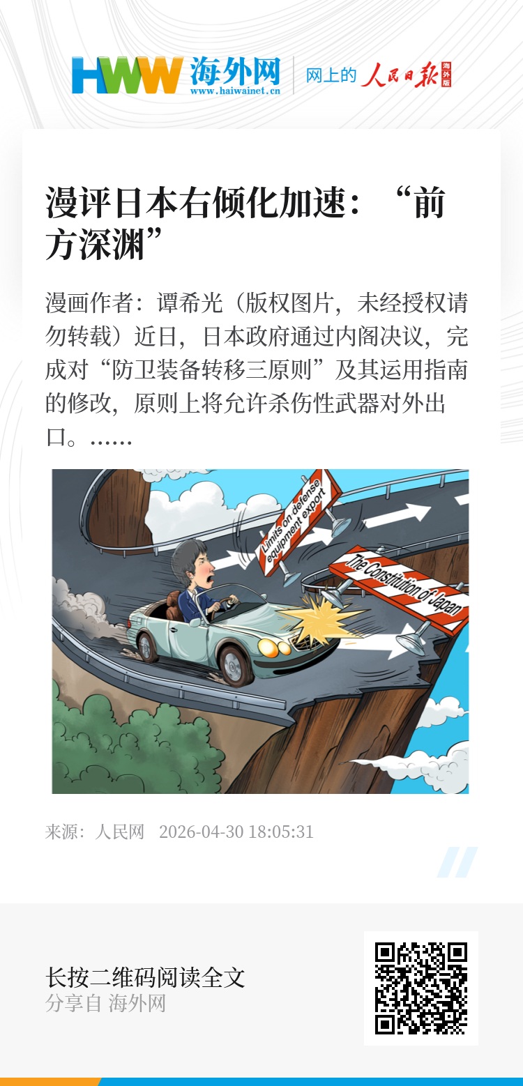 日本正式解禁杀伤性武器出口,严重违背和平宪法,彻底破坏战后国际秩序。高市早苗政府为日本武器出口“松绑”,无异于在“新型军国主义”的危险道路上再度踩下油门,一路狂飙。