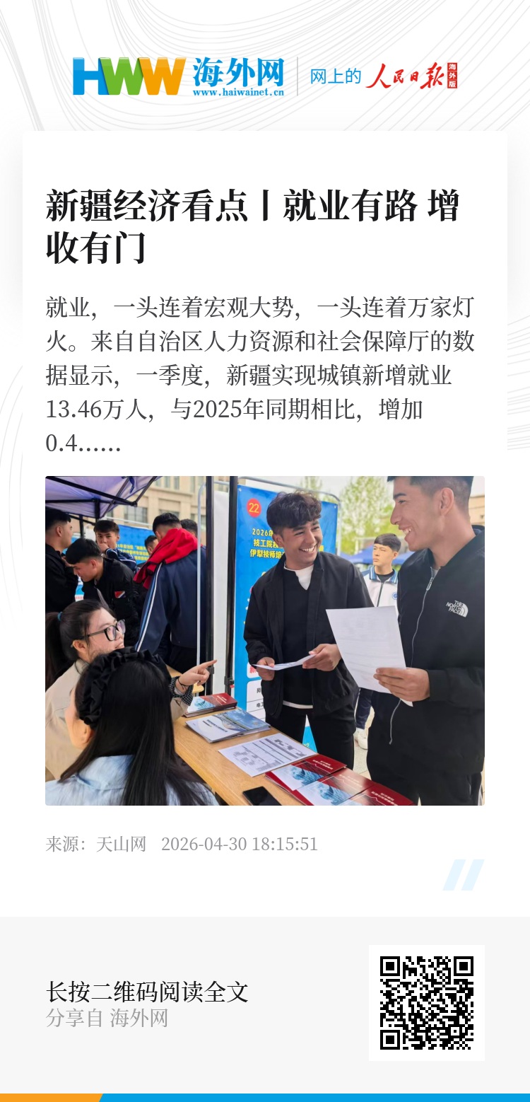 来自自治区人力资源和社会保障厅的数据显示,一季度,新疆实现城镇新增就业13.46万人,与2025年同期相比,增加0.45万人。